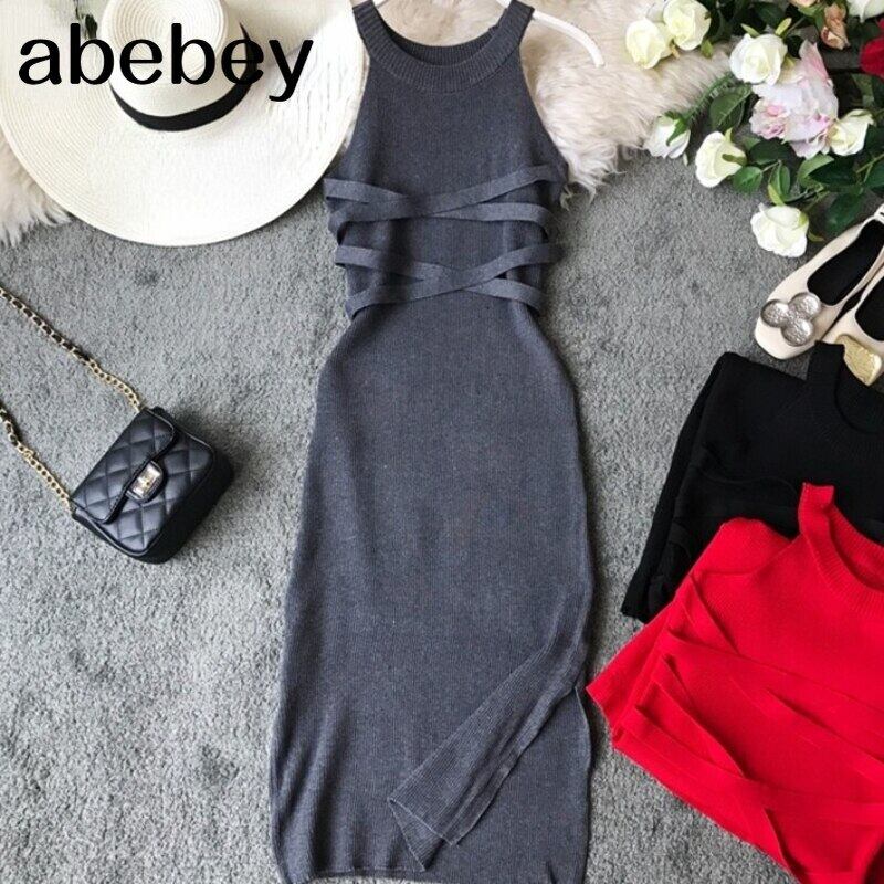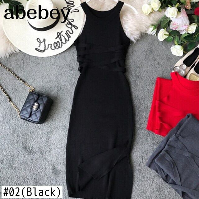 Vestidos無地ニットストレッチボディコンドレス2022ホルターノースリーブサマードレスウエストローブ11839 夏物 ソリッドカラー Abe72483412299