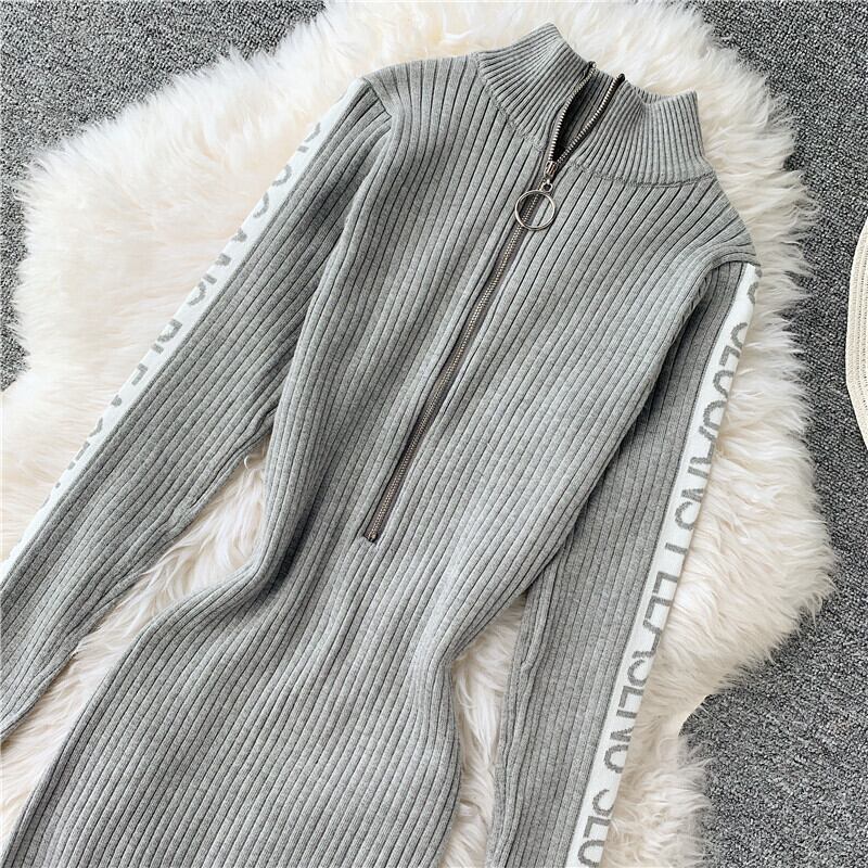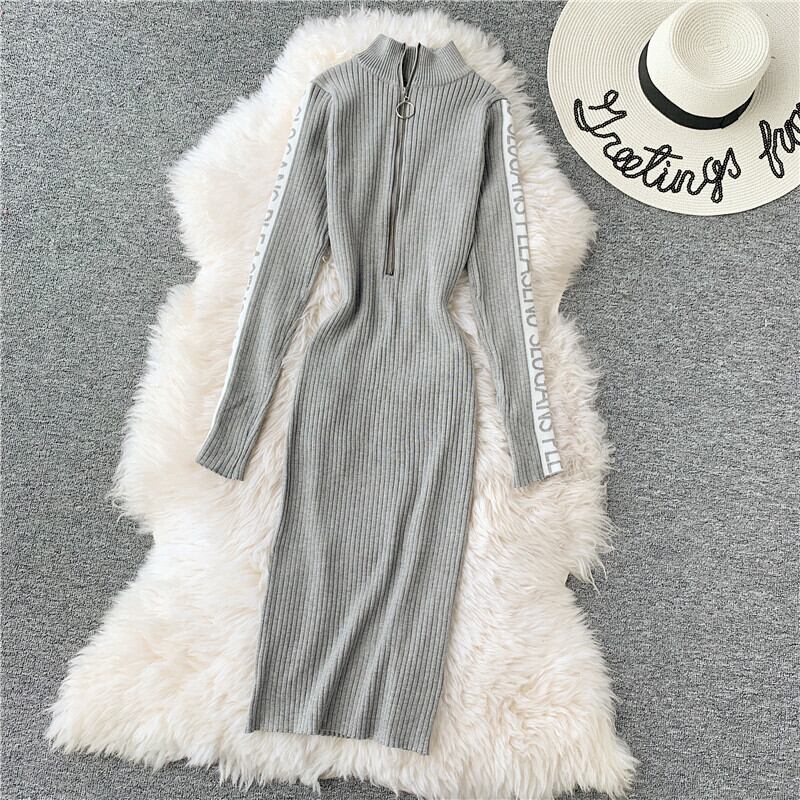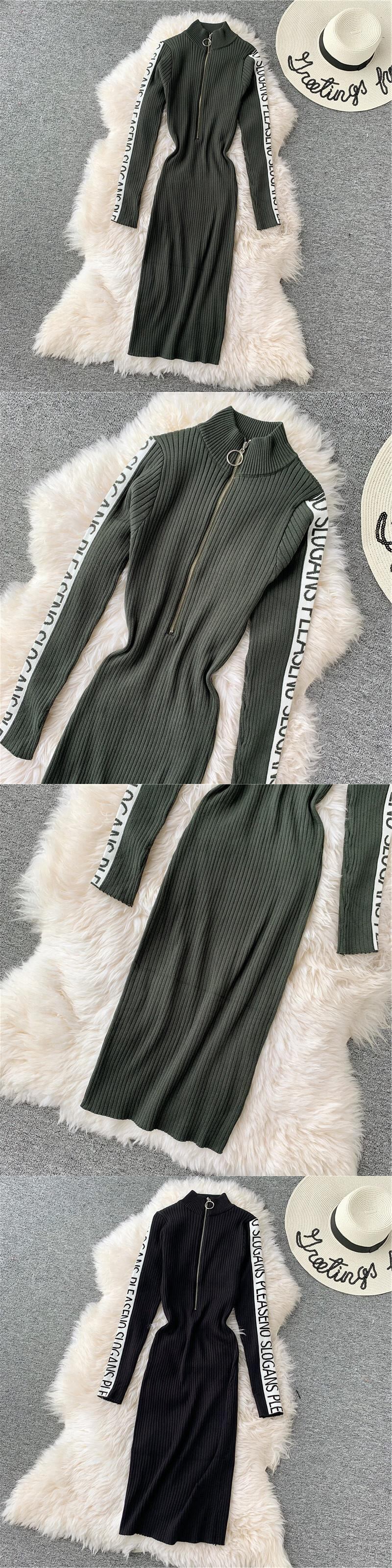 2022年秋冬 セータードレス ジッパー ラウンドネック レタースリーブ 痩身ボトム ニットドレス 膝丈 オータム 秋物 ウィンター 冬物 Oネック Abe18916071979