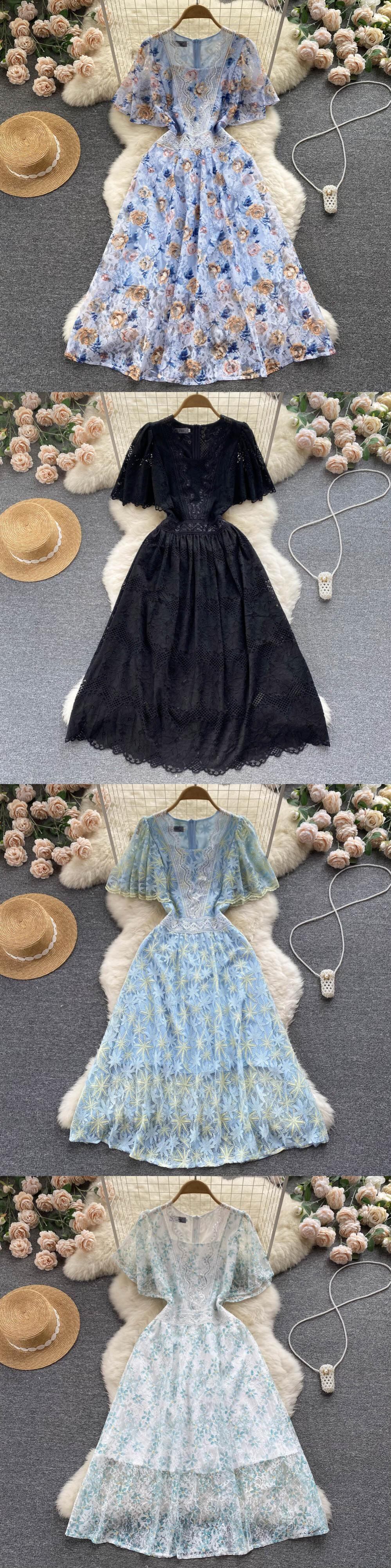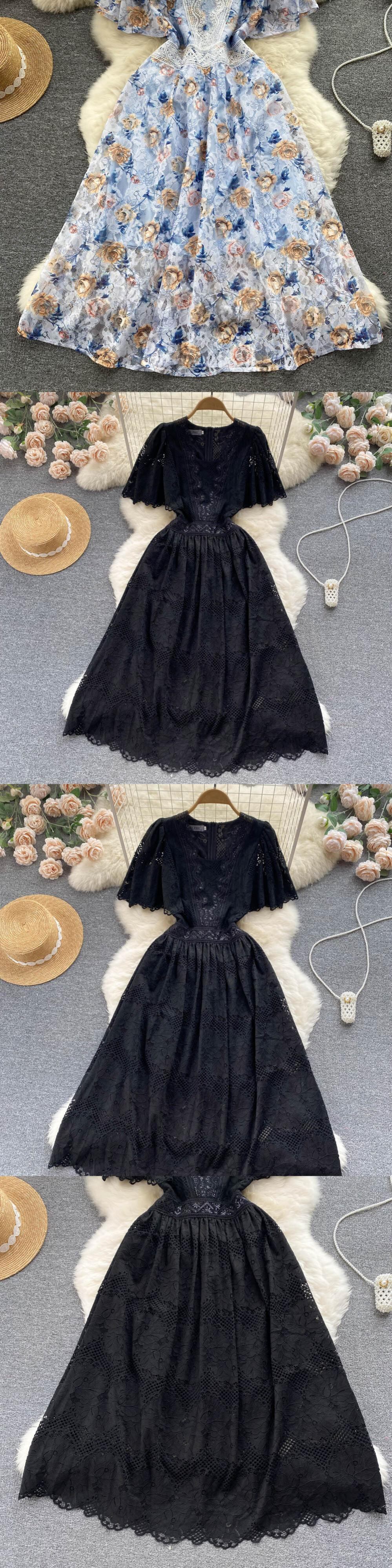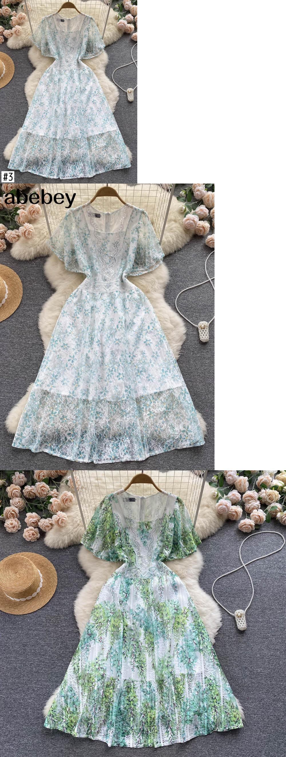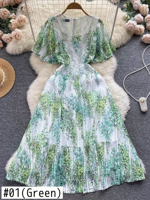 夏の女性グリーンプリントパーティーマキシロングドレスボヘミアン半袖ウエストスクエアカラーローブ Vestidos ショート ハーフスリーブ サマー 夏物 スクウェア Abe39515458159
