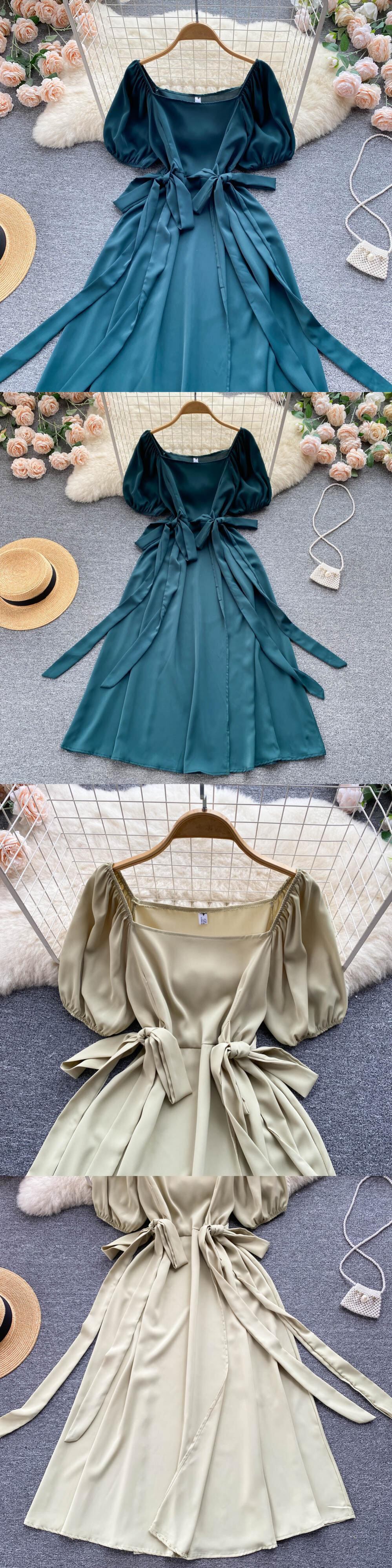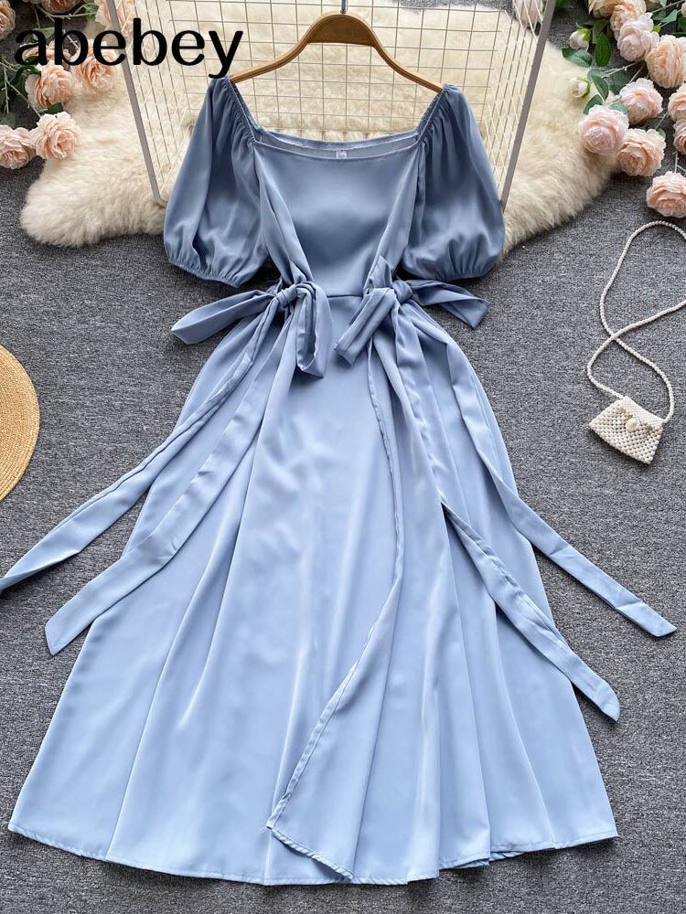 スクエアカラープリーツドレス女性春夏 2022 イエロー/ブルー/レッドウエスト包帯パーティー Vestidos ローブ スプリング 春物 サマー 夏物 スクウェア Abe84821580104