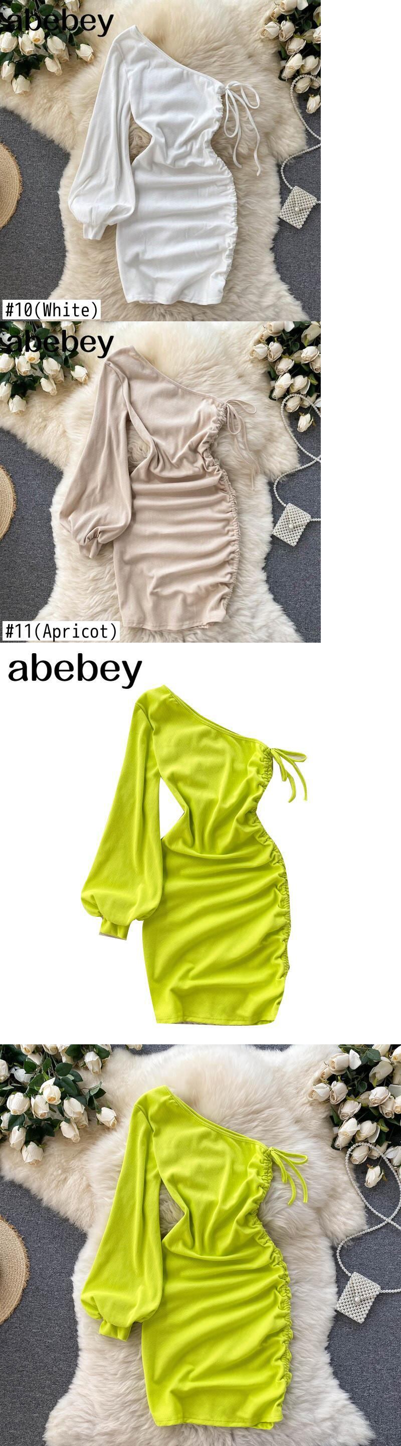 女性ワンショルダードレス斜め襟パフスリーブシャーリングスリムドレス夏オフショルダー巾着サンドレス サマー 夏物 Abe71159383465