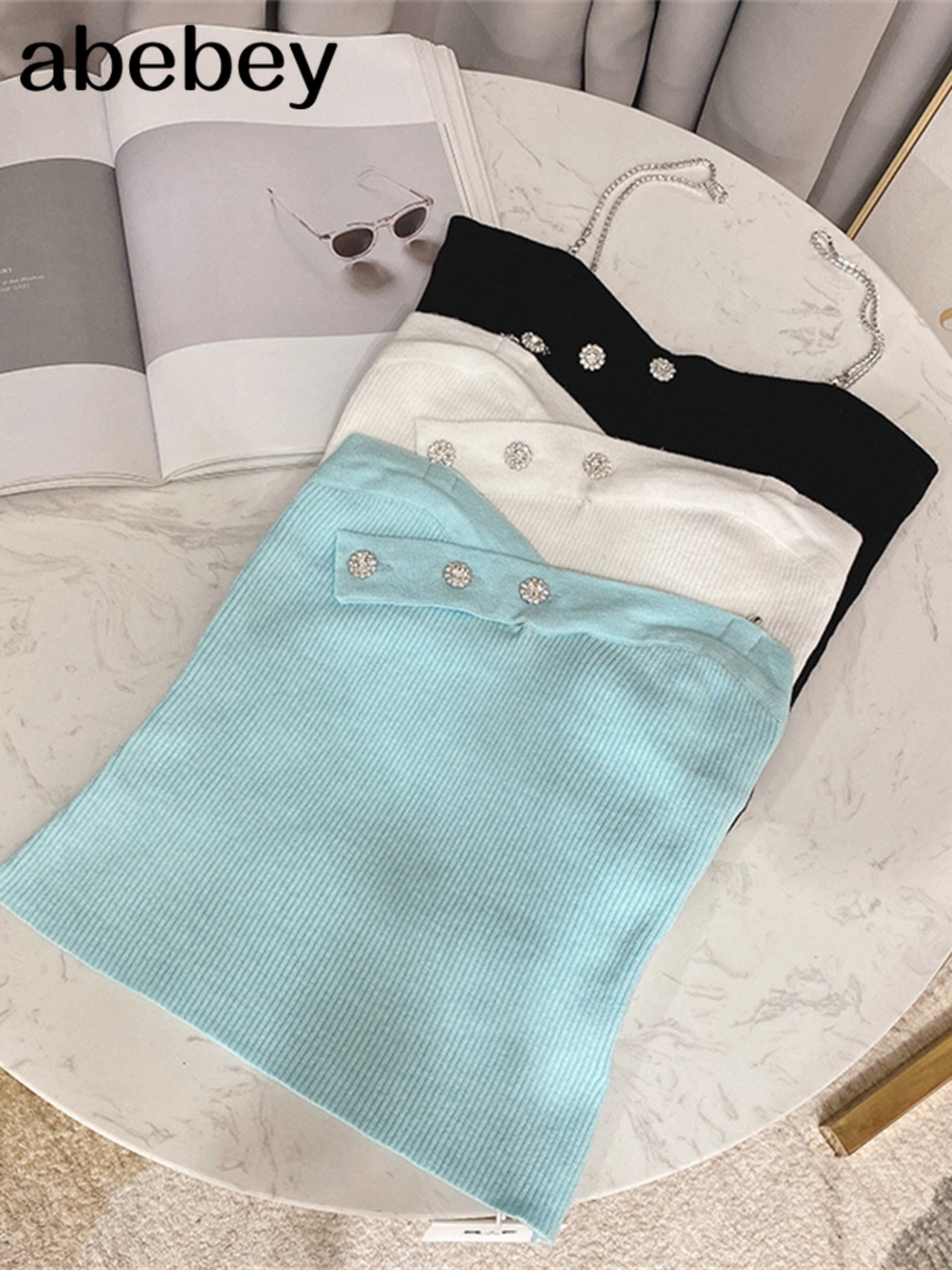 2022 夏パールタンクトップ女性ノースリーブクロップショートキャミソールストリート弾性ウエストニットキャミソール エラスティック 伸縮 サマー 夏物 真珠 Abe67548614014