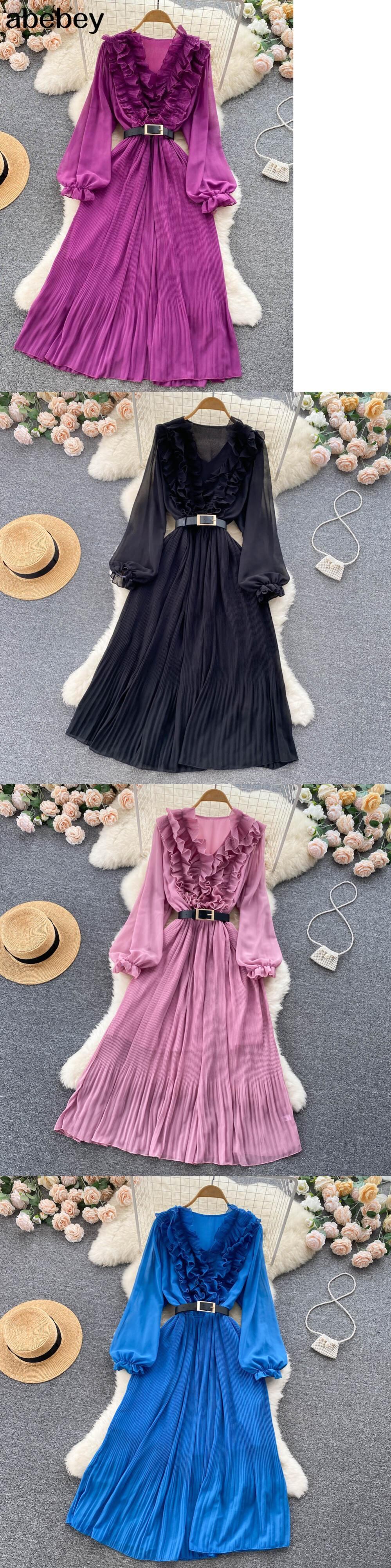 夏の女性プリーツロングドレス V ネック長袖ウエスト A ライングリーン/ブルー/ピンクビッグスイングマキシ Vestidos サマー 夏物 Vネック Aライン Abe24967787451
