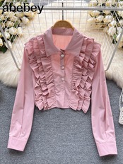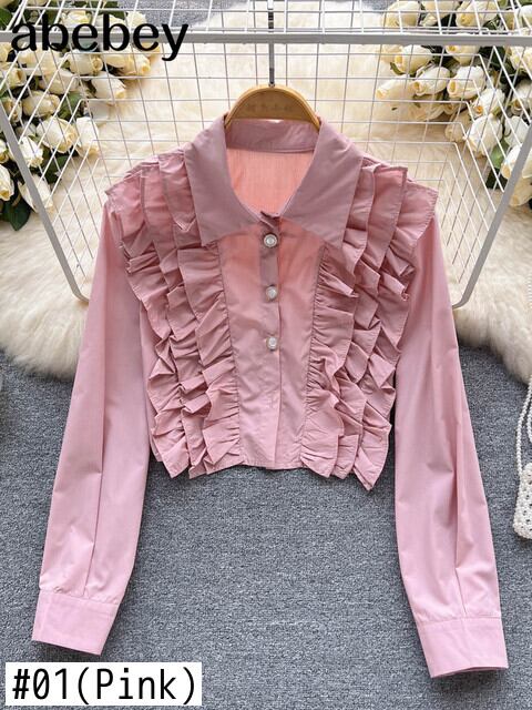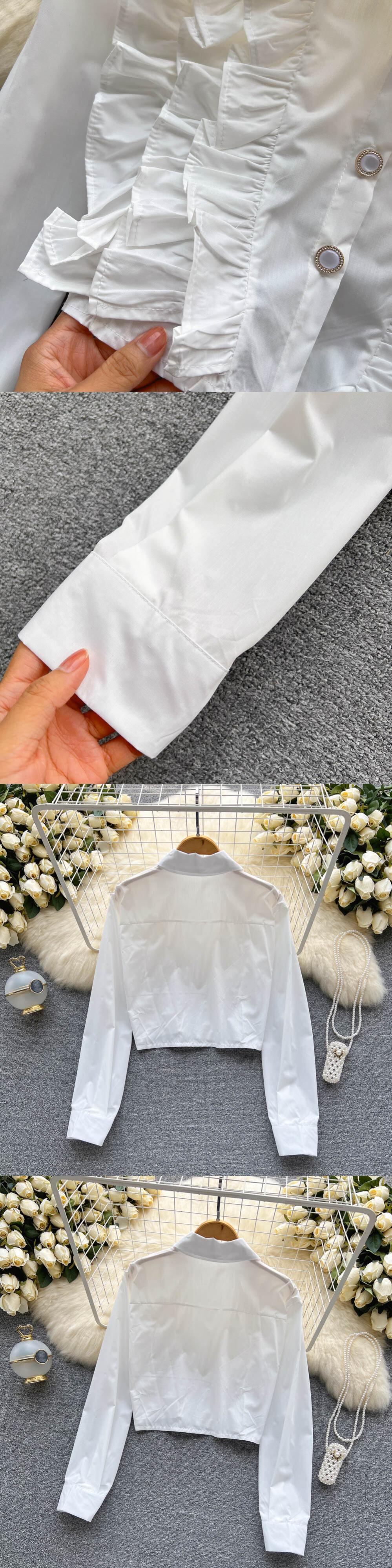 ショートホワイトシャツ女性ラミネートフリルパッチワークラペル長袖ゴールドボタンレトロスウィート Tシャツコットントップス ロング 大人ガーリー キュート カジュアル Abe57777568686