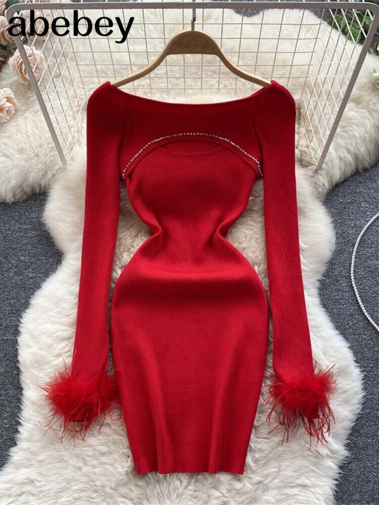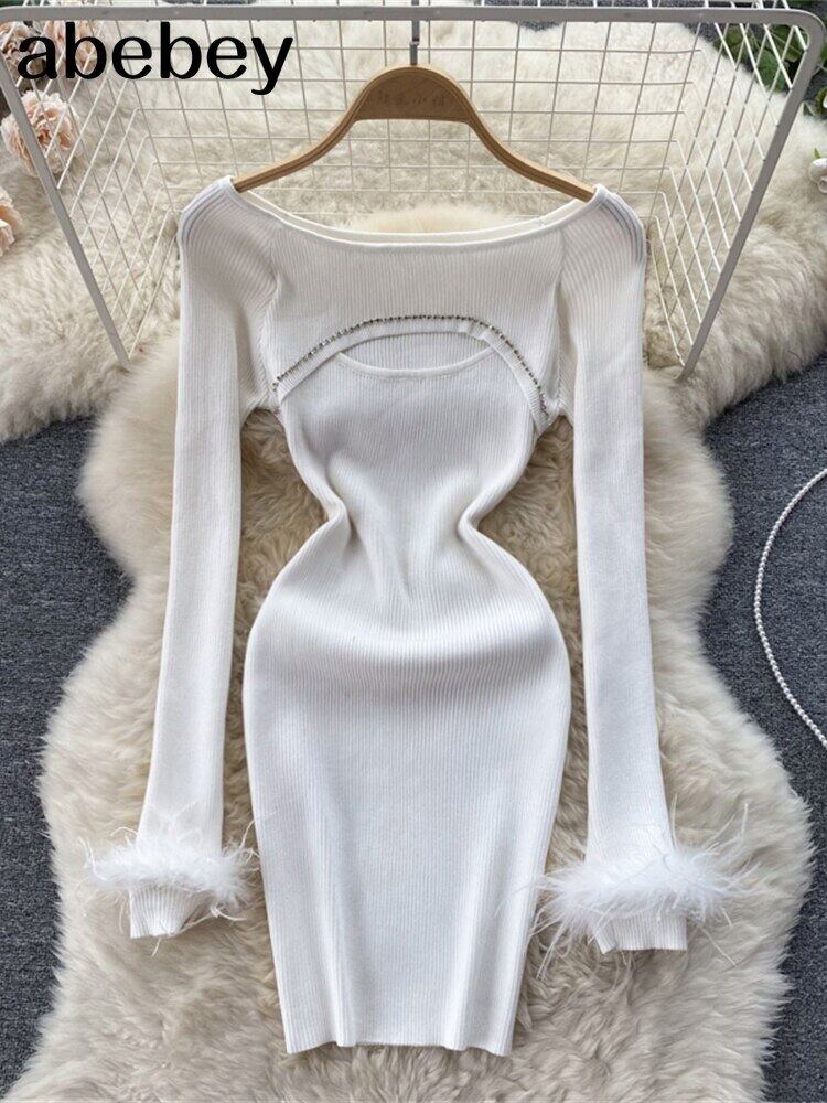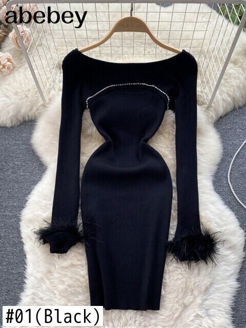 中空アウト女性ニットドレス長袖ビーズ弾性スリムペンシルミニドレスビーズセクシーなボディコンセータードレス ロング エラスティック 伸縮 Abe83346897342