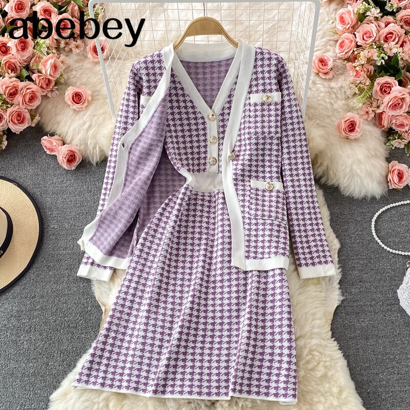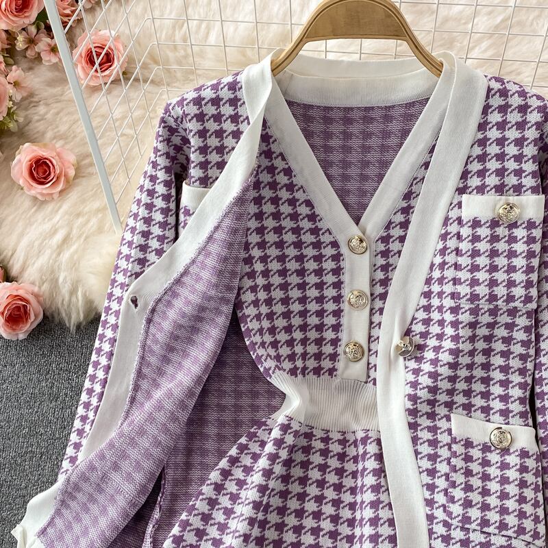 女性秋冬千鳥格子ニットセット長袖シングルブレストカーディガン + ノースリーブタンクドレスツーピーススーツ ロング オータム 秋物 ウィンター 冬物 Abe75705852033