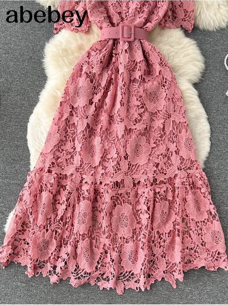 女性の夏の花の刺繍半袖中空アウトレースミディドレスセクシーなサッシパーティードレス Vestidos ショート ハーフスリーブ サマー 夏物 フラワーデザイン Abe51212913850