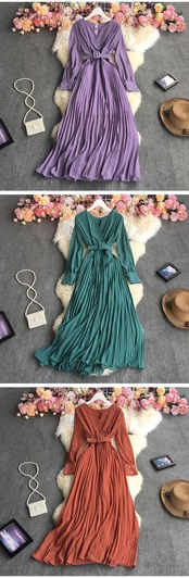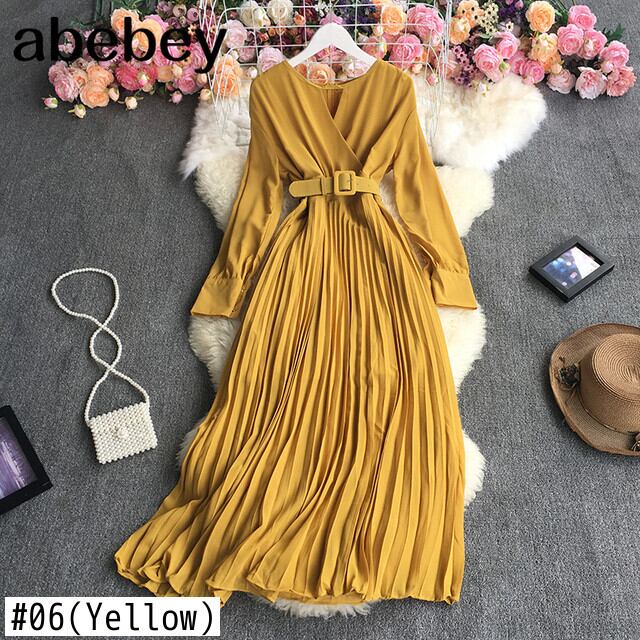 2022春秋の気質Vネック長袖ドレスハイウエストレースアップウエスト無地ロングAラインプリーツドレス ハイウェスト スプリング 春物 オータム 秋物 ソリッドカラー Abe41642294492