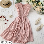 2022 V ネックフリルボタンミディドレス夏パーティータンクサンドレス女性ウエスト A ラインビーチホリデー Vestido デ · フェスタ ラッフル サマー 夏物 Vネック Aライン Abe10734555959