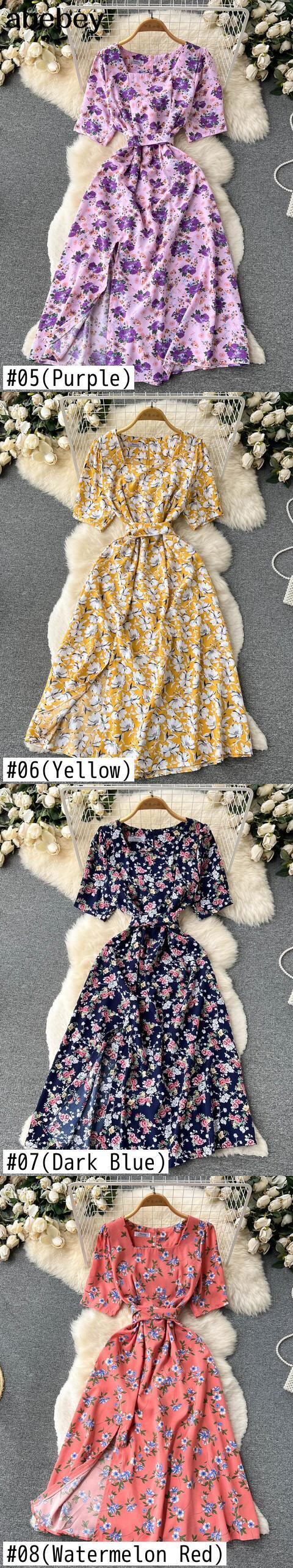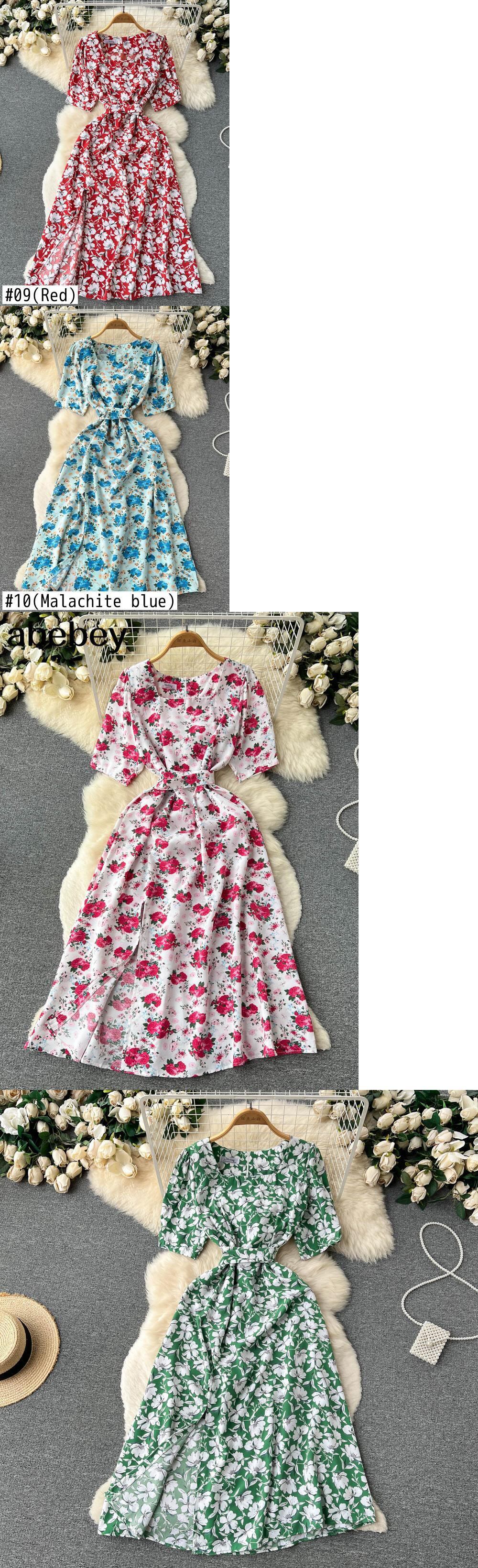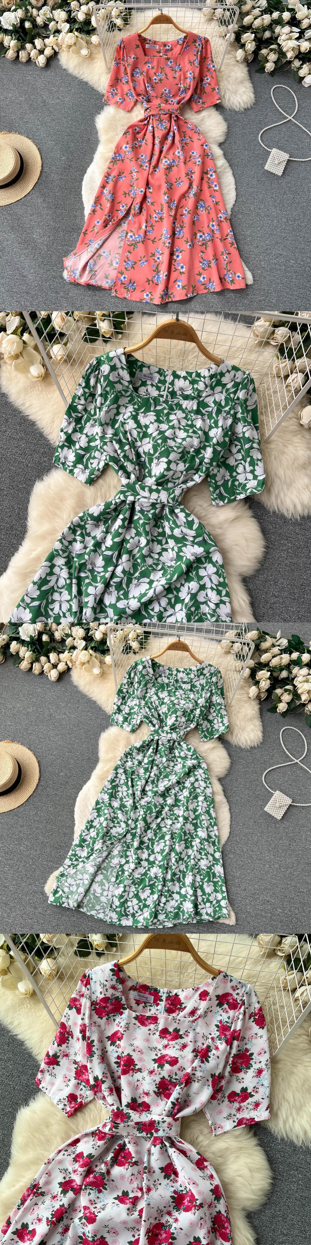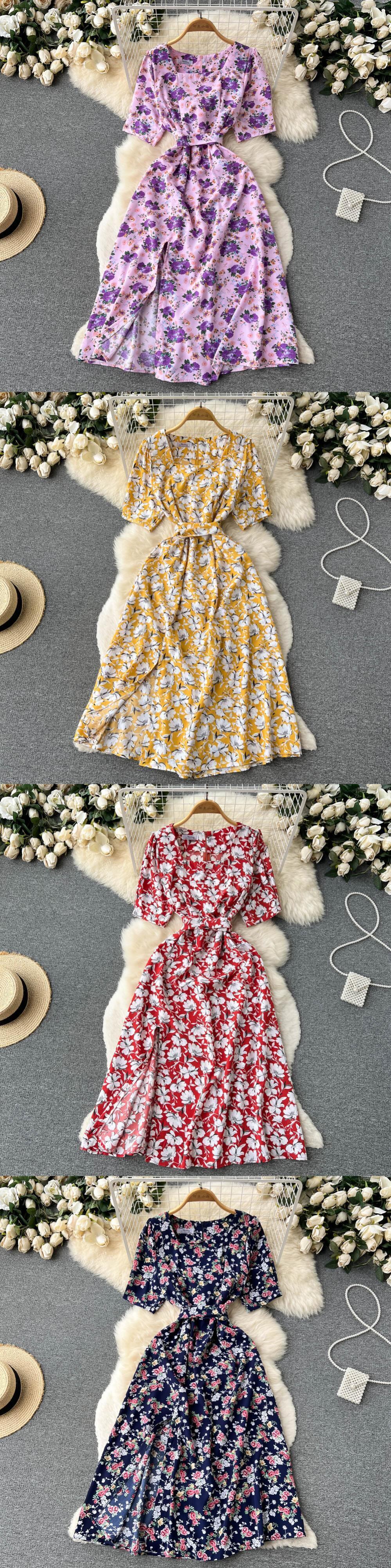 夏の女性のプリントマキシドレスセクシーなイエロー/グリーン/レッドウエスト半袖スプリット Vestidos スリムローブ 2022 ショート ハーフスリーブ サマー 夏物 Abe32399816451