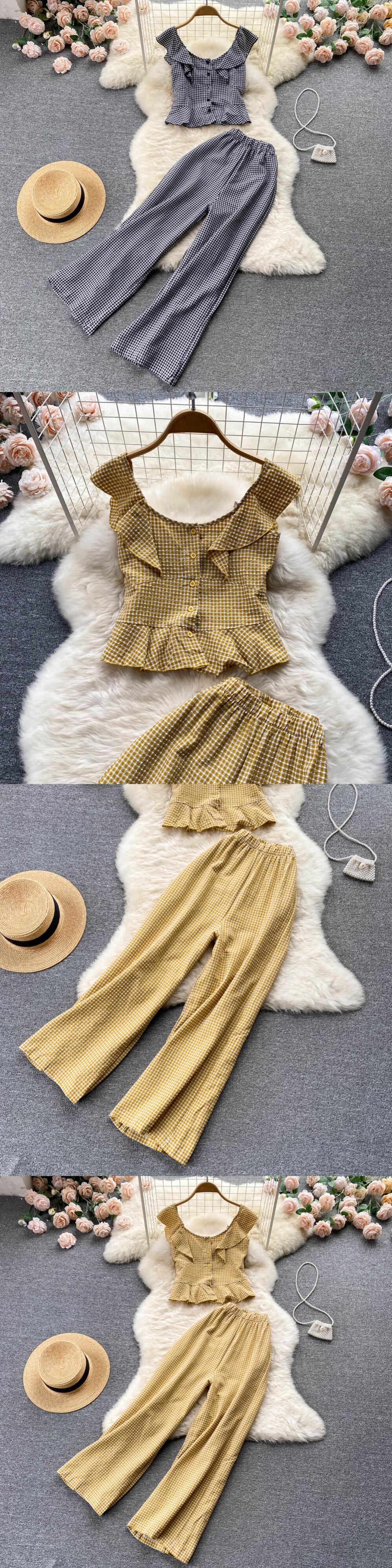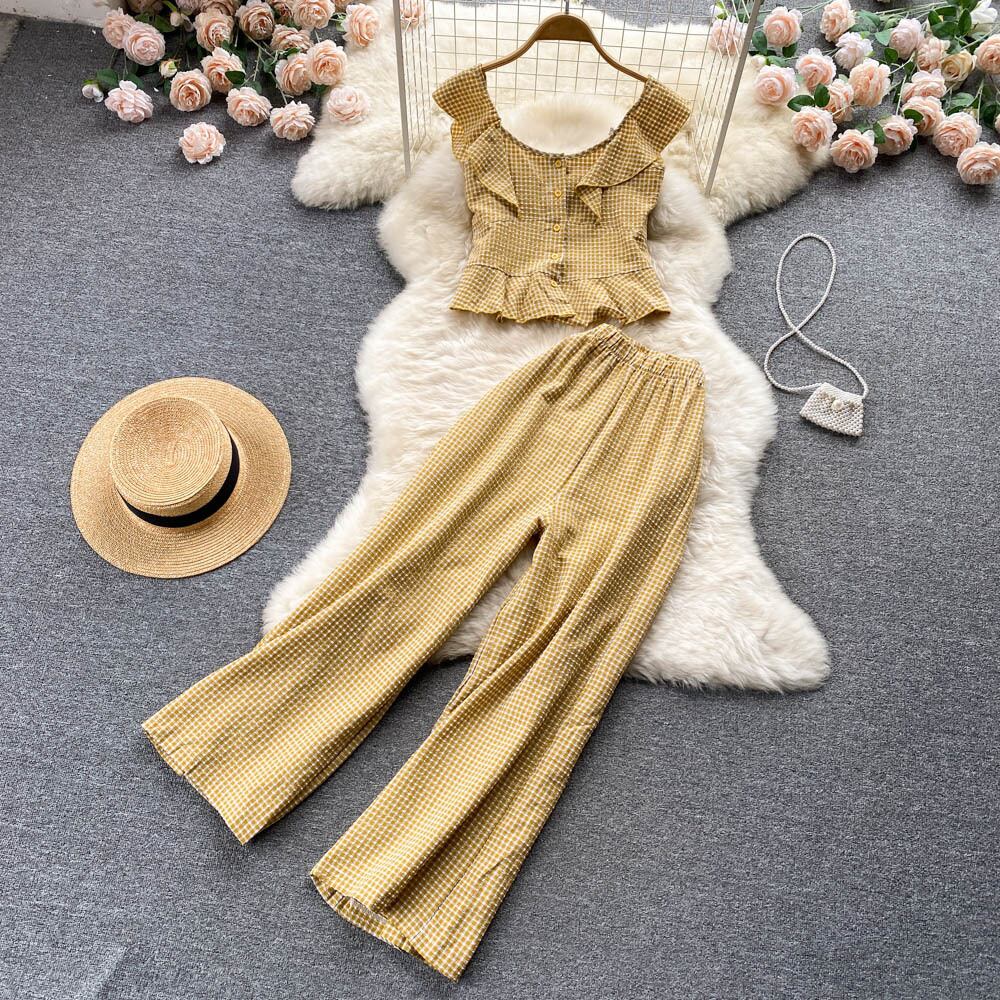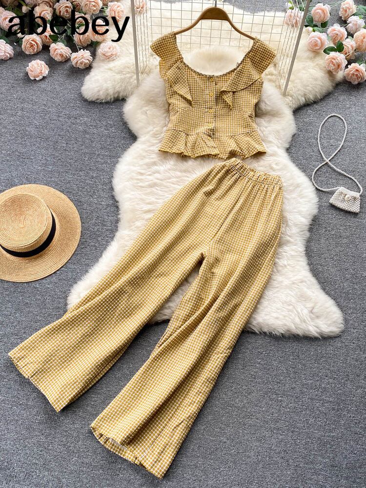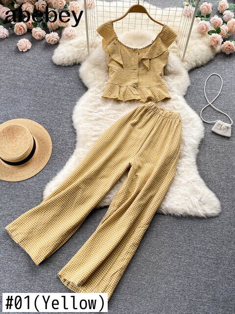 女性の夏のパンツスーツ 2 点セットチェック柄プリントノースリーブトップ & ワイドレッグパンツ衣装 2022 サマー 夏物 ワイドパンツ Abe9827999428