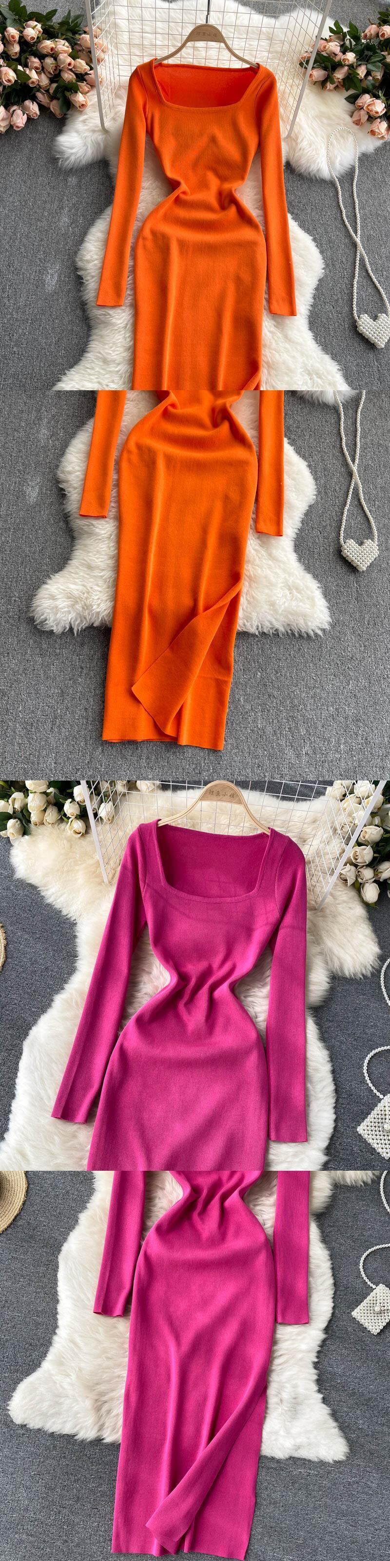 女性シックなニットドレスレトロボディコンスクエアカラースリムペンシルドレス秋冬セクシーなスプリットセータードレス オータム 秋物 ウィンター 冬物 スクウェア Abe67014605628