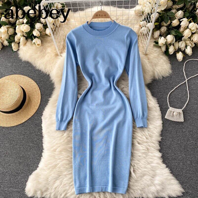 女性ニットドレス長袖 O ネックスリムシースドレス 2022 秋冬セクシーなボディコン暖かいセータードレス ロング オータム 秋物 ウィンター 冬物 Oネック Abe55975552458