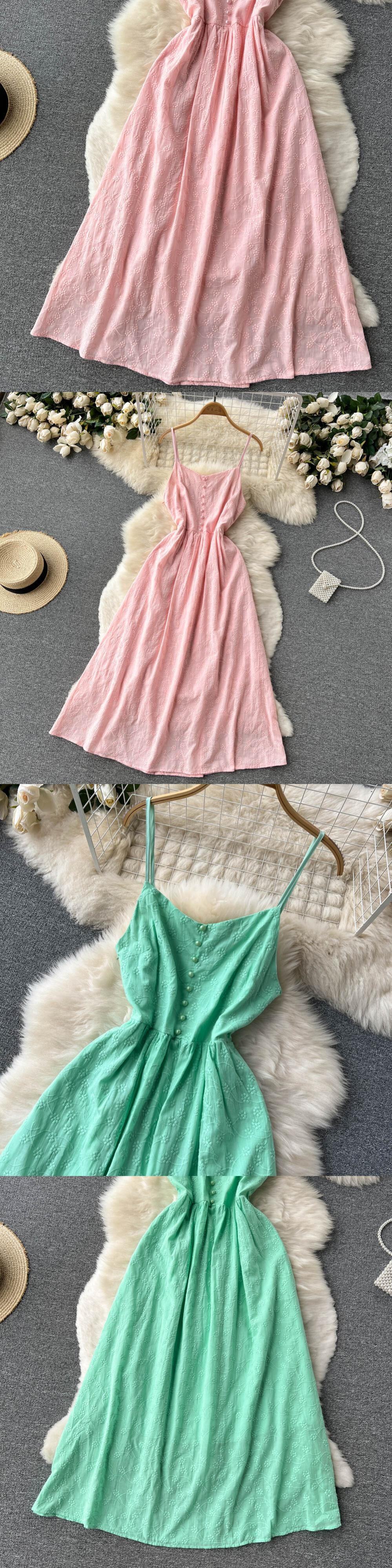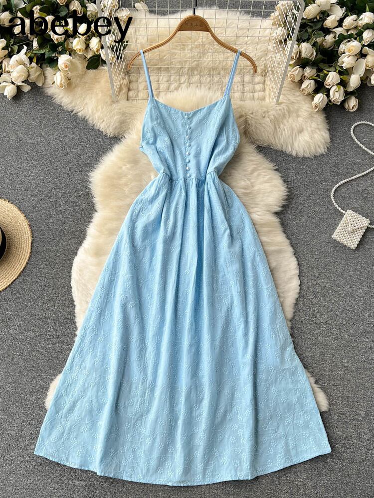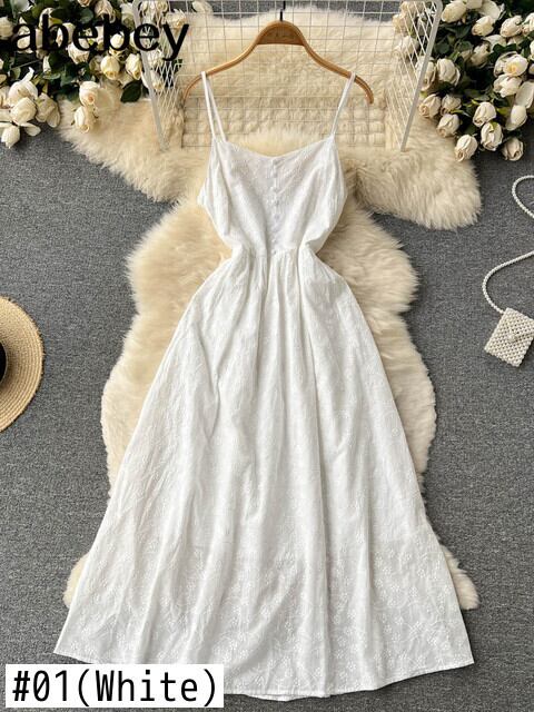 コットンホワイトVネックサスペンダー女性ドレスサマーソリッドハイウエストフリルAラインドレスレースアップボタンドレス ハイウェスト 夏物 ソリッドカラー Abe77817080184