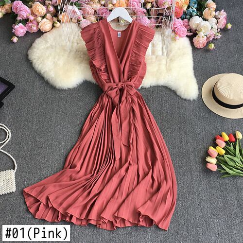 2022年春秋Vネックノースリーブワンピースフリルハイウエストレースアップ無地ミドル丈Aラインプリーツワンピース ハイウェスト ラッフル スプリング 春物 オータム 秋物 ソリッドカラー Abe93902308711