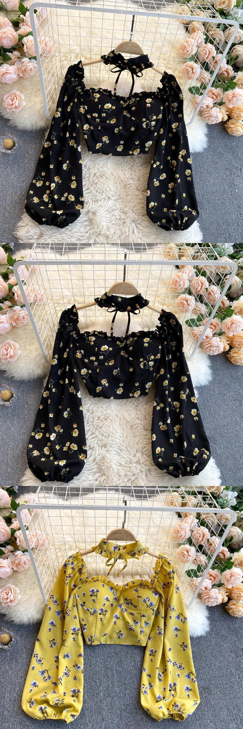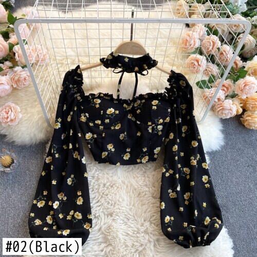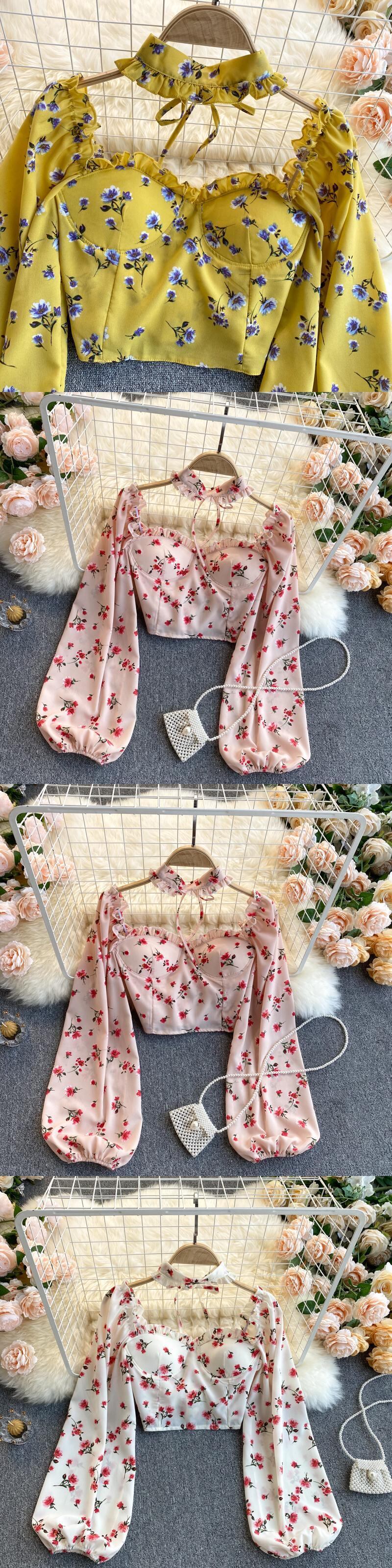 2022 セクシーな女性はゴシック花柄シフォンブラウスシャツ長袖ピンクレディークロップトップス ロング Abe61901901001