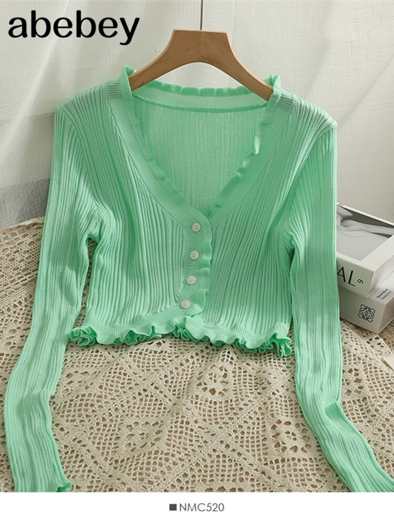ニットセーター コート カーディガン レディース ショートセーター 長袖 Vネック 緑 青 冷房 薄手コート セーター ロング ブルー グリーン Abe96698997090
