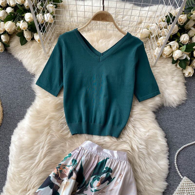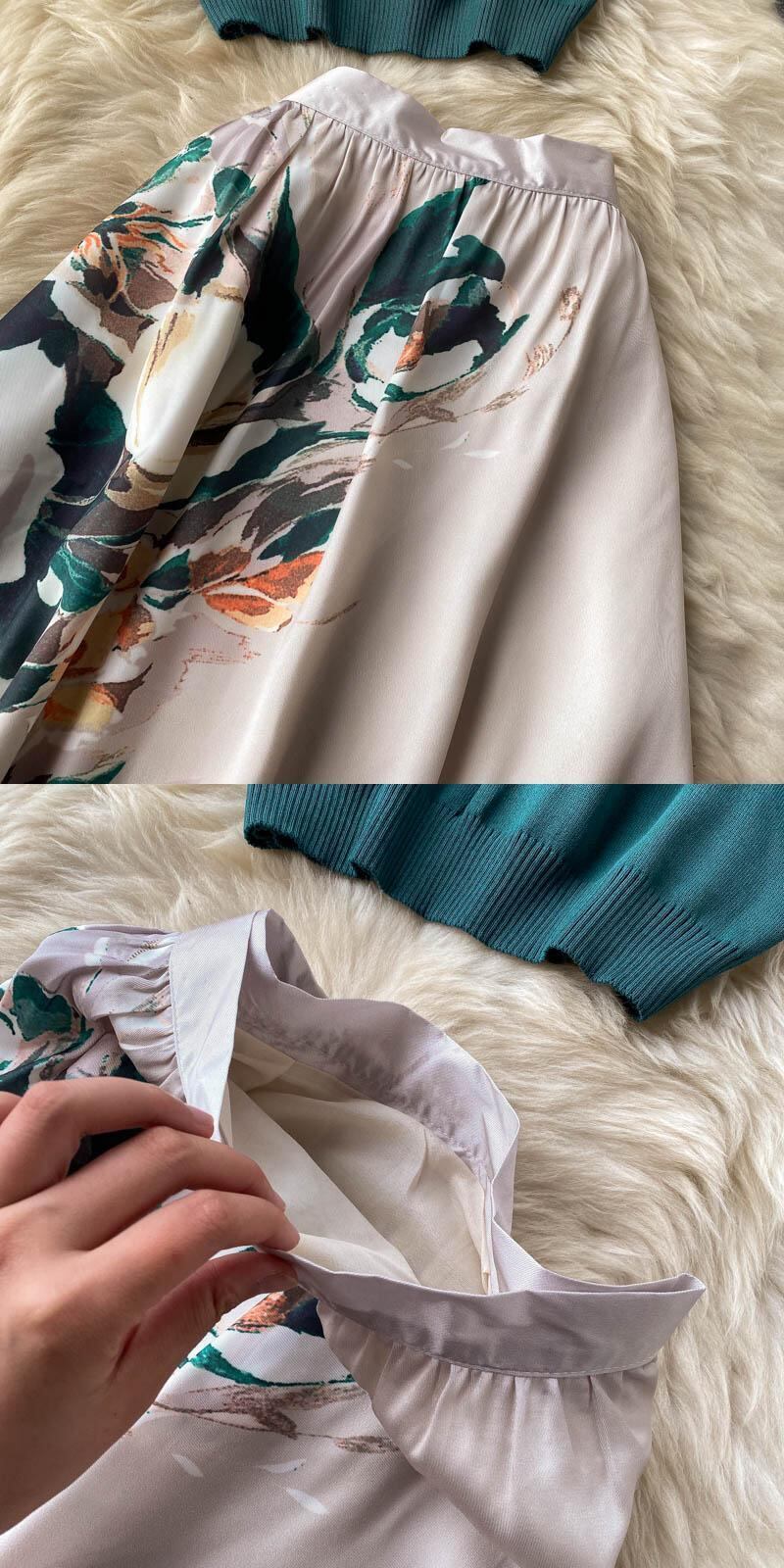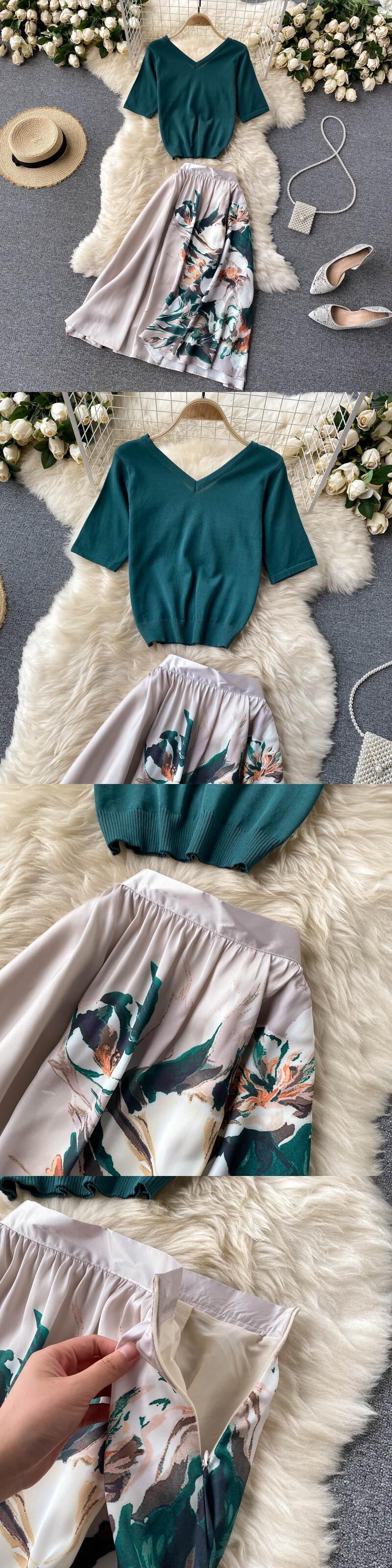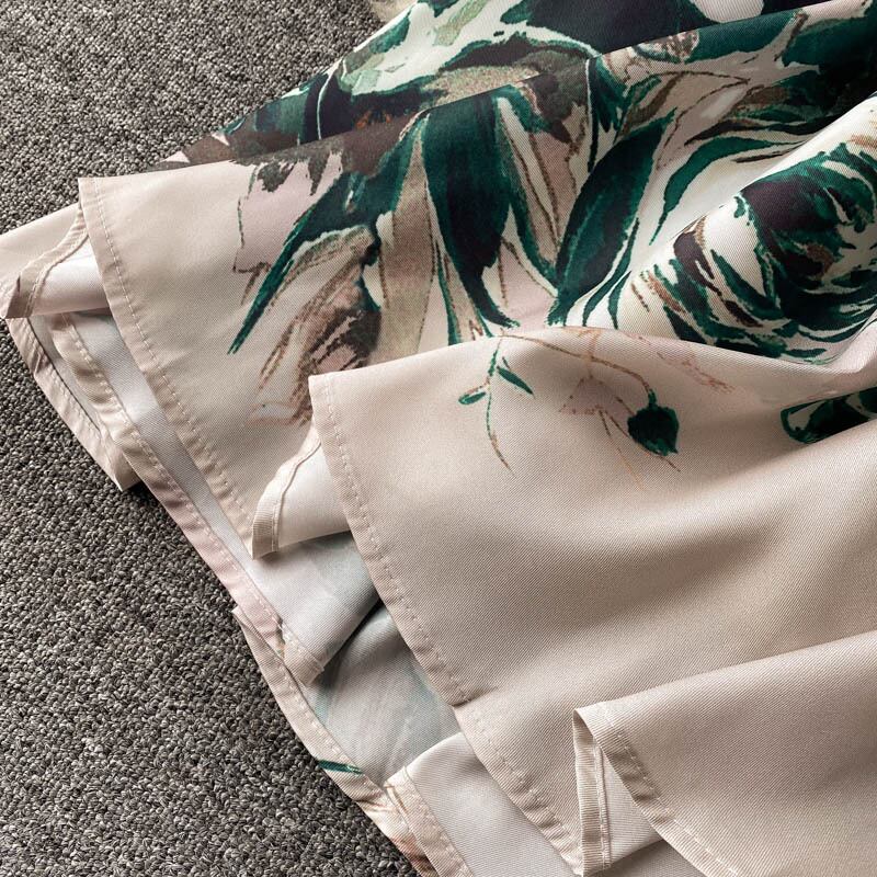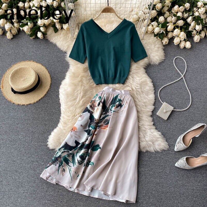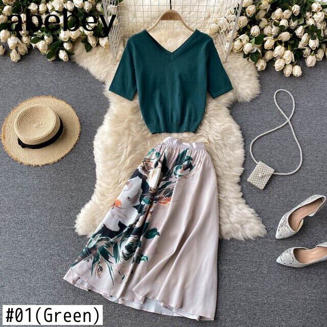 女性春ボヘミアンプリントバケーションセットパフスリーブ V ネックショートトップス + ウエストマキシスカートツーピーススーツ スプリング 春物 Vネック Abe48695065034