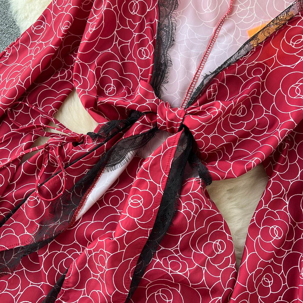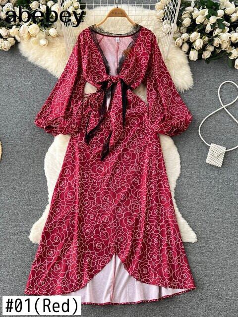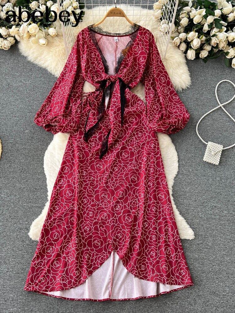 不規則な秋の女性レッドプリントロングドレス V ネックロングランタンスリーブ A ラインフリルマキシ Vestidos 2022 オータム 秋物 Vネック Aライン Abe16564970773