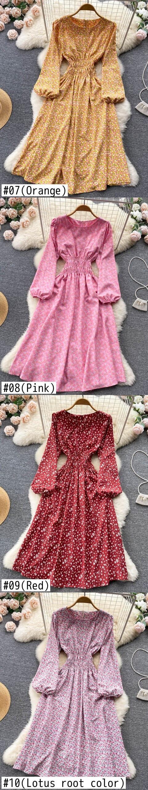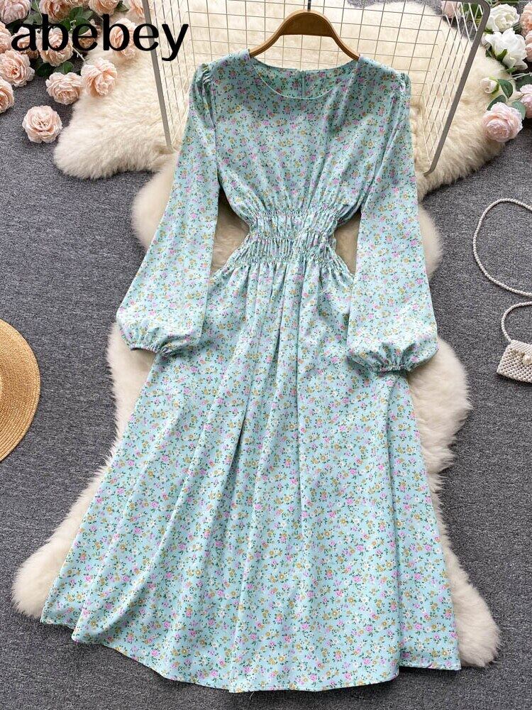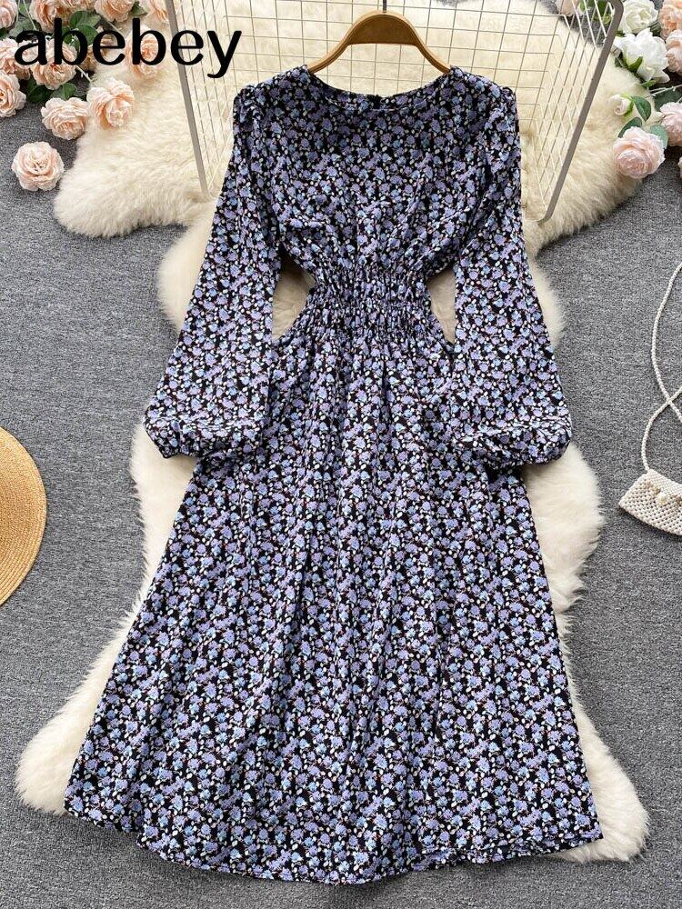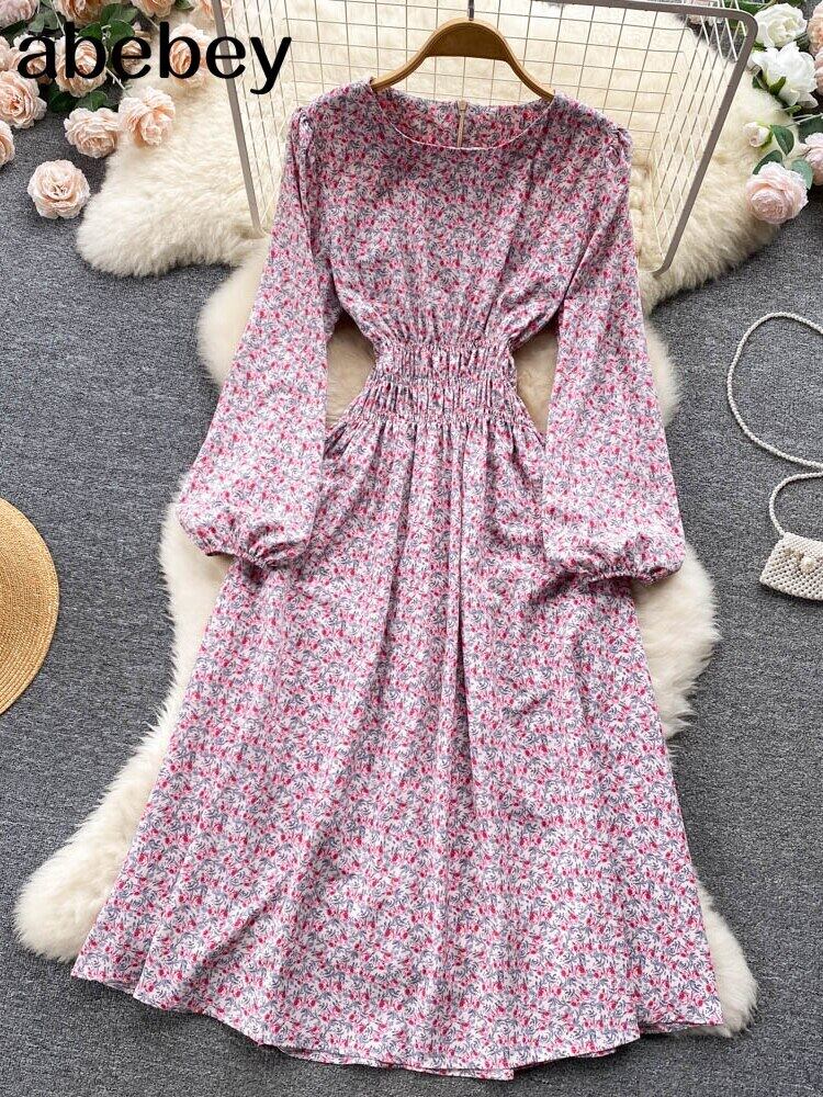 春秋の女性プリント O ネック パフ スリーブ ドレス ホリデー スタイル ウエスト A ライン ミディアム ロング ドレス スプリング 春物 オータム 秋物 Oネック Aライン Abe20596885486
