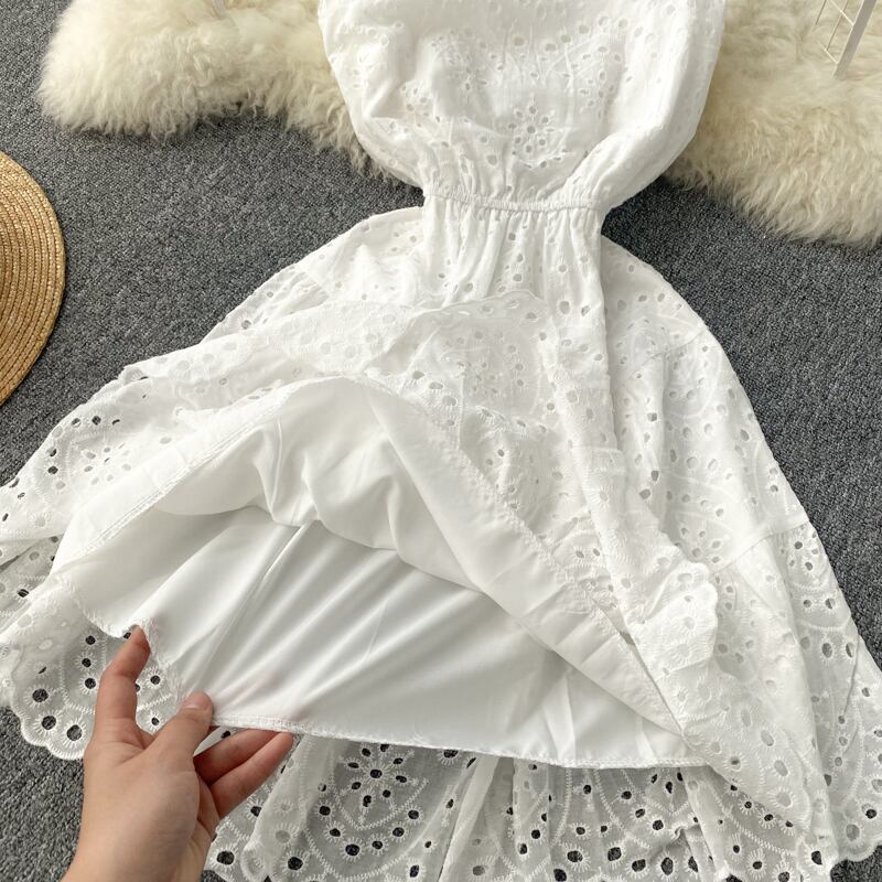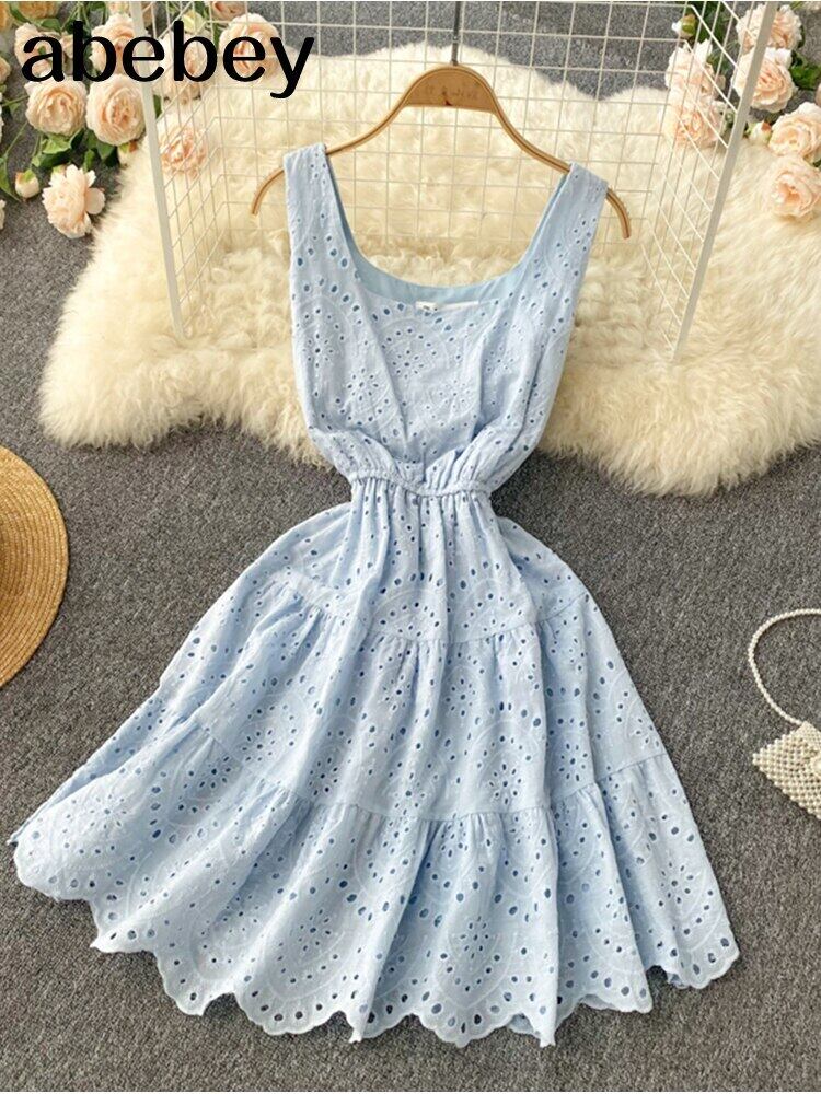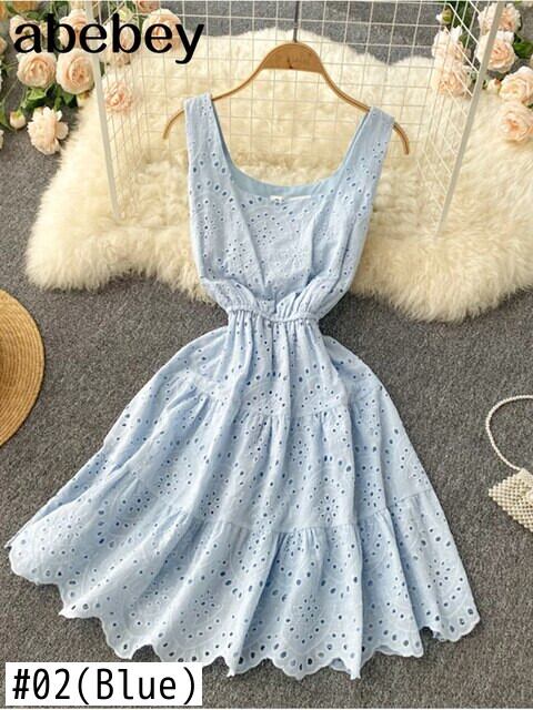 2022 女性フレンチレースドレスノースリーブ中空バックレス A ラインドレス夏弾性シャーリングストリートミディドレス エラスティック 伸縮 サマー 夏物 Aライン Abe42155427186