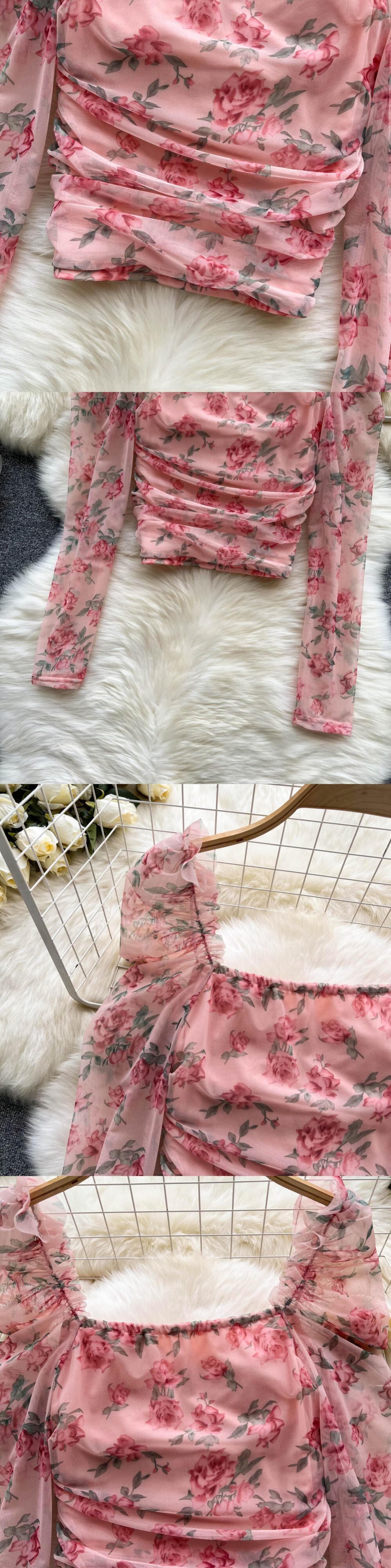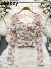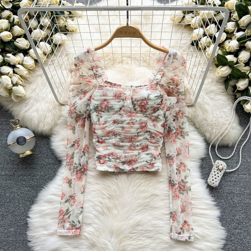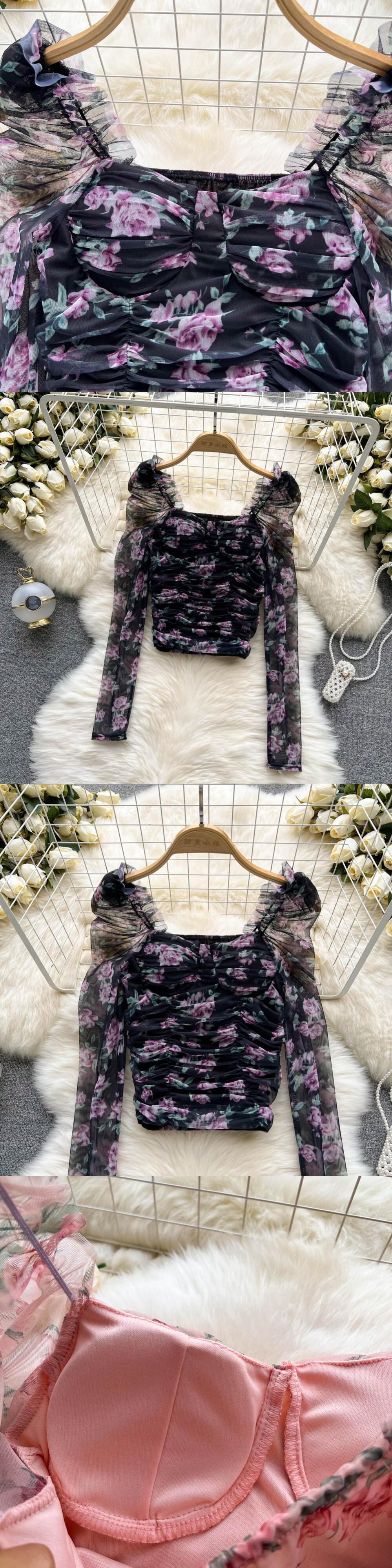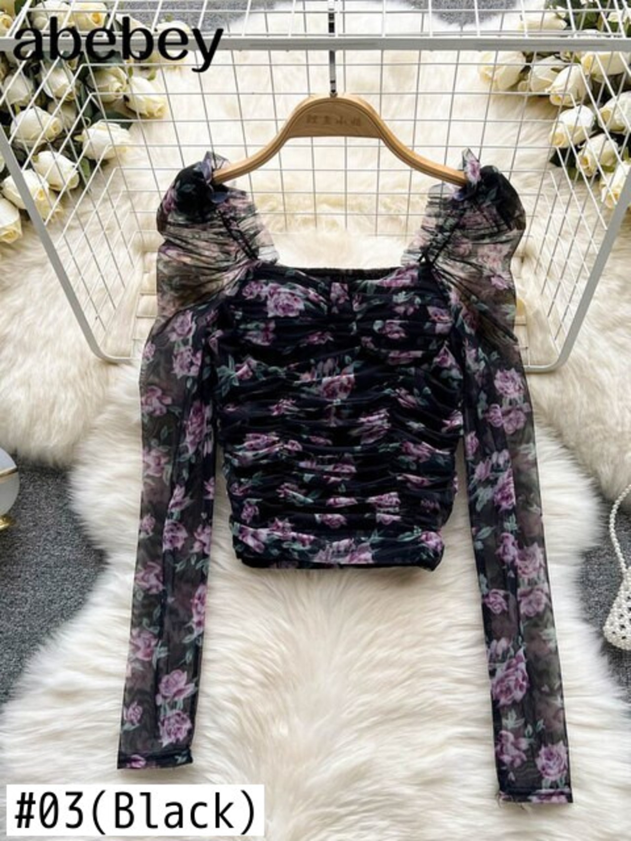 2022 夏の女性プリーツ花柄シフォンブラウス長袖スクエアカラーシャツクロップトップ ロング サマー 夏物 スクウェア Abe45856850140