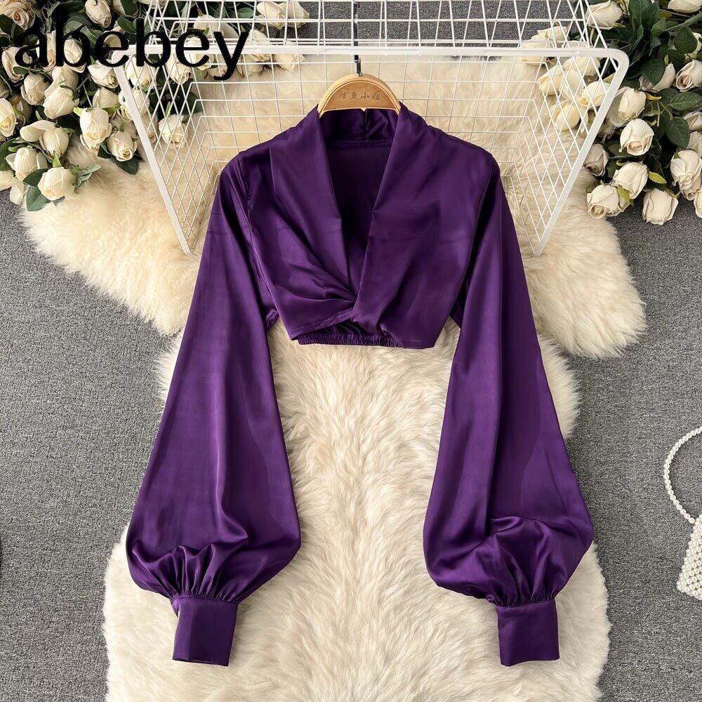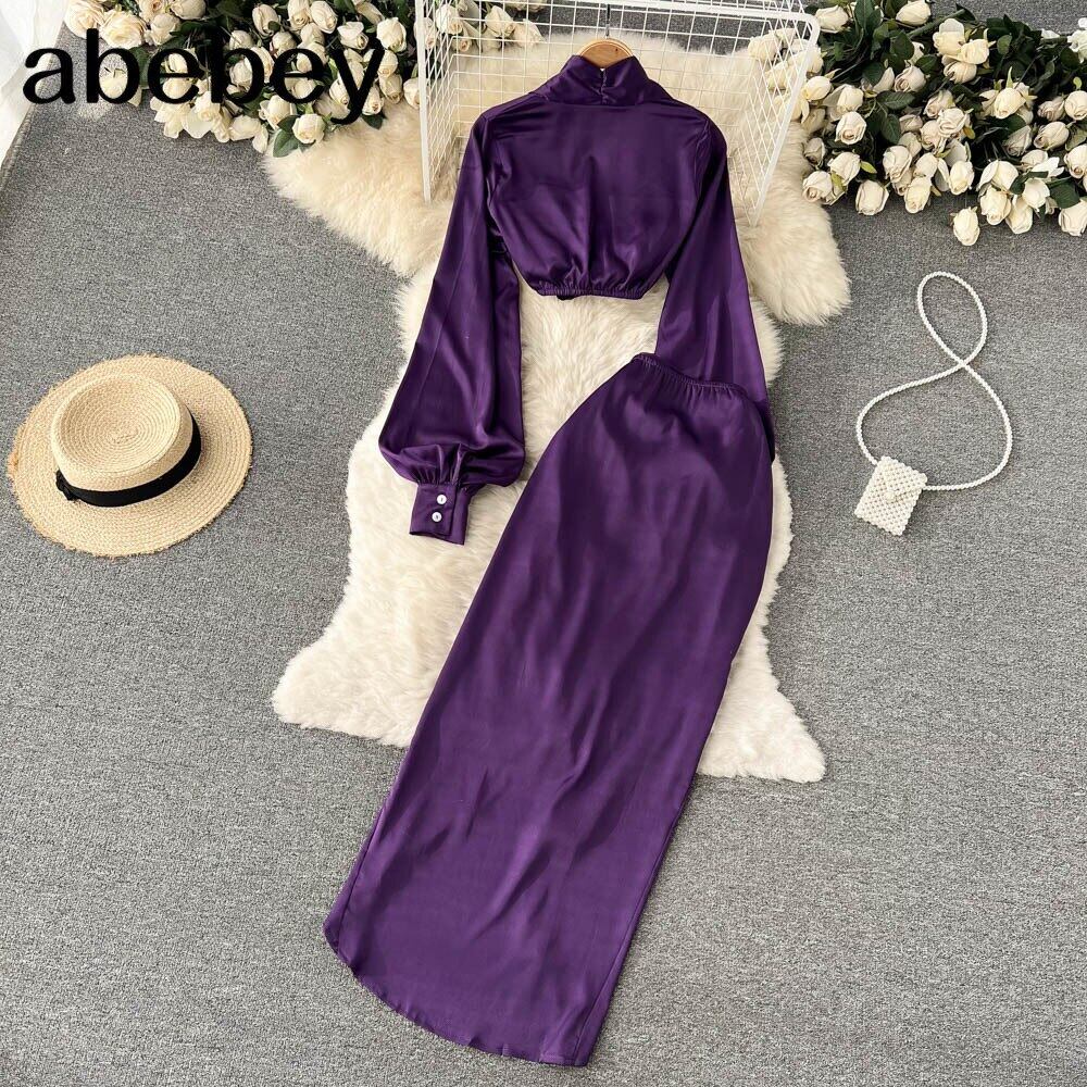 2022 春気質サテンツーピーススーツ長袖ショートトップス + ウエスト不規則なスプリットロングスカートセット女性 スプリング 春物 Abe28676655494