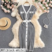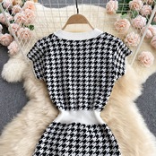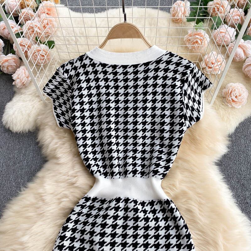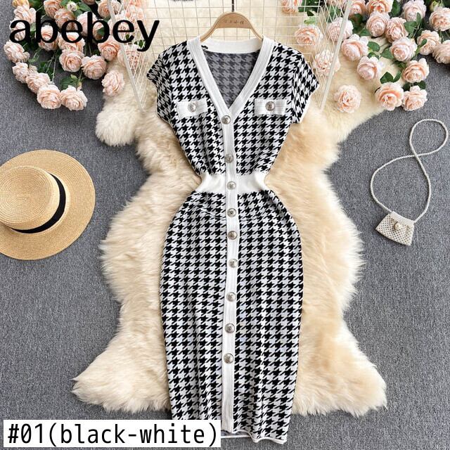 レトロ千鳥格子ニットドレス女性半袖 V ネック弾性スリムドレス夏セクシーなボディコンストリートサンドレス ショート ハーフスリーブ エラスティック 伸縮 サマー 夏物 Vネック Abe81624986980