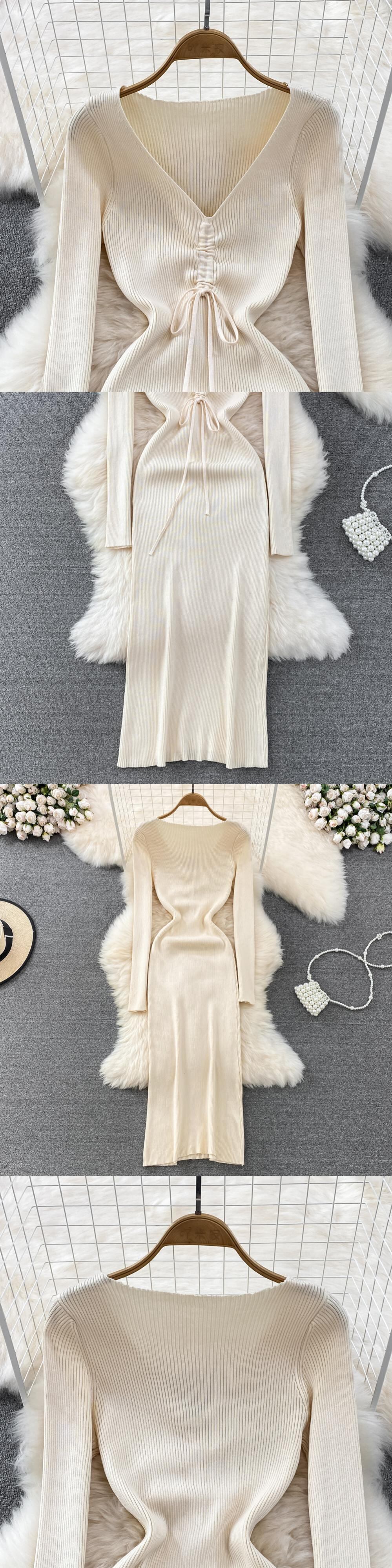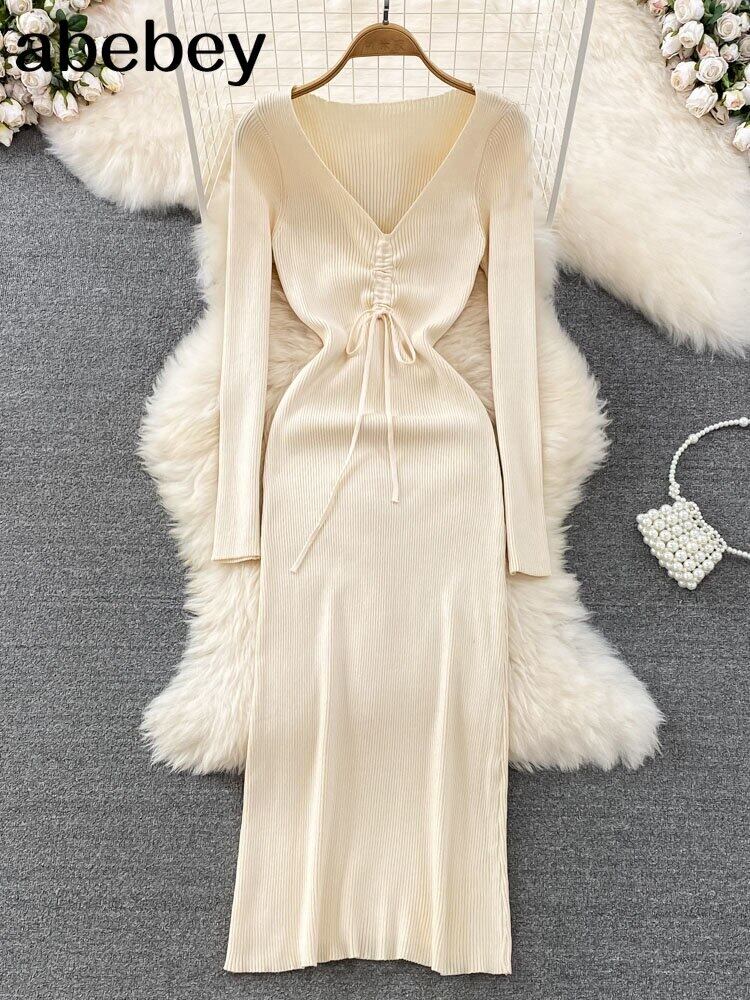 ブルー女性ニットペンシルドレス長袖 V ネック弾性スリムドレス秋冬セクシーなボディコン暖かいセータードレス ロング エラスティック 伸縮 オータム 秋物 ウィンター 冬物 Vネック Abe94123997245