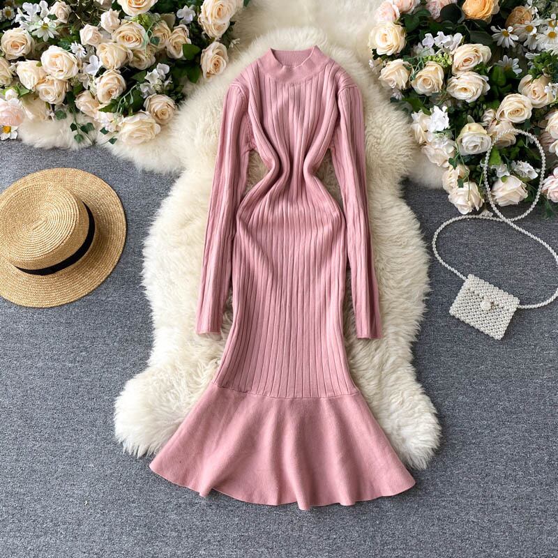 ニットフィッシュテールドレス女性 2022 弾性暖かい長袖 A ライン Vestidos 秋冬ボディコンセータードレス ロング エラスティック 伸縮 オータム 秋物 ウィンター 冬物 Aライン Abe96368651990