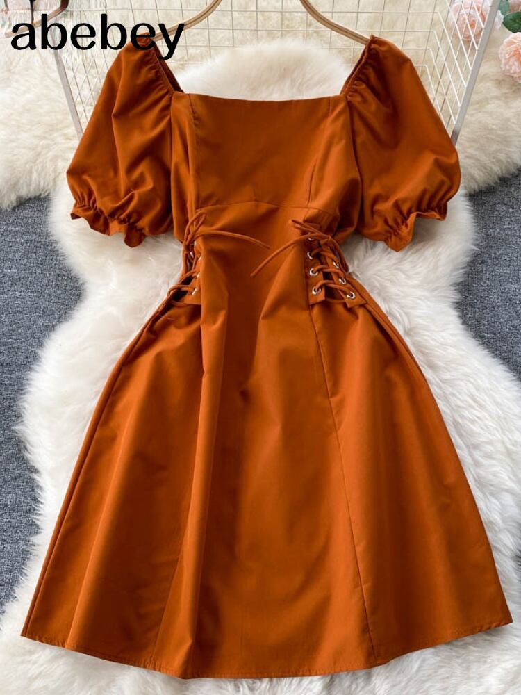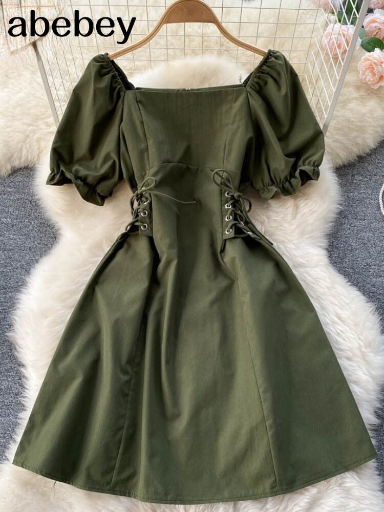 2022 スクエアネックサマードレス女性半袖レースアップサンドレス A ラインビーチミディドレス ショート ハーフスリーブ 夏物 Aライン スクウェア Abe33613183229