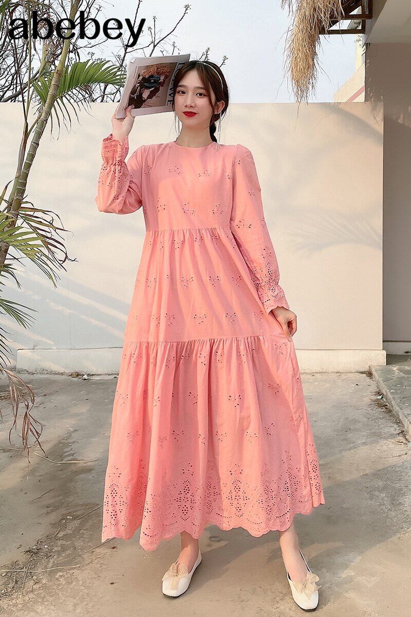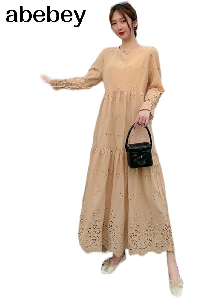 2022 春の女性オールマッチ O ネック長袖ドレス中空アウトレース緩いカジュアルドレス ロング スプリング 春物 Oネック Abe65939355097