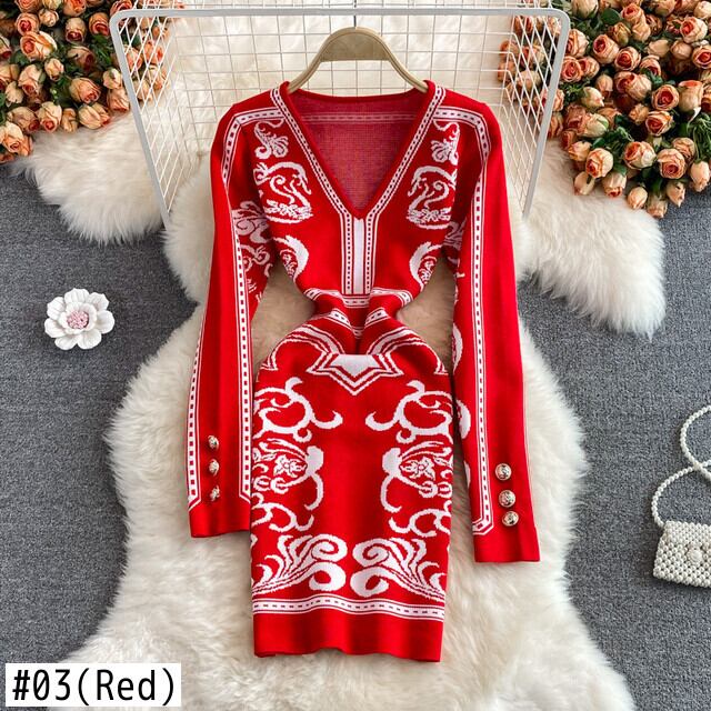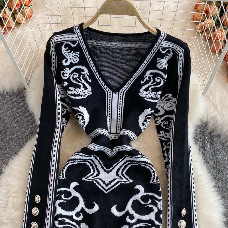 女性のレトロなプリントニットドレス長袖 V ネックスリムシースドレス 2022 秋冬ボディコン暖かいセータードレス ロング オータム 秋物 ウィンター 冬物 Vネック Abe2056196337