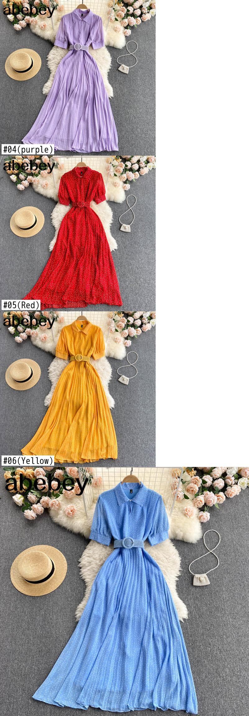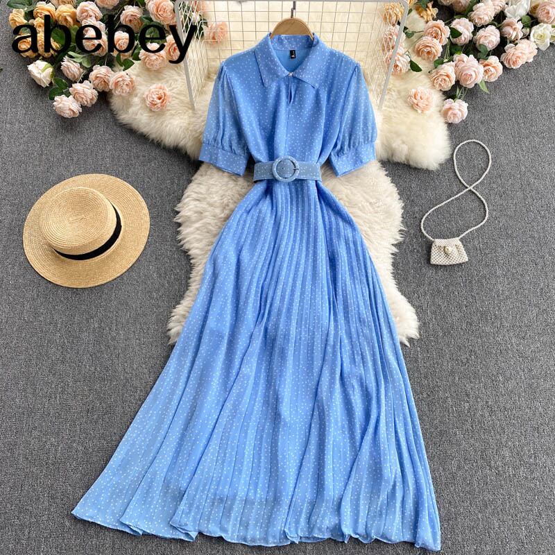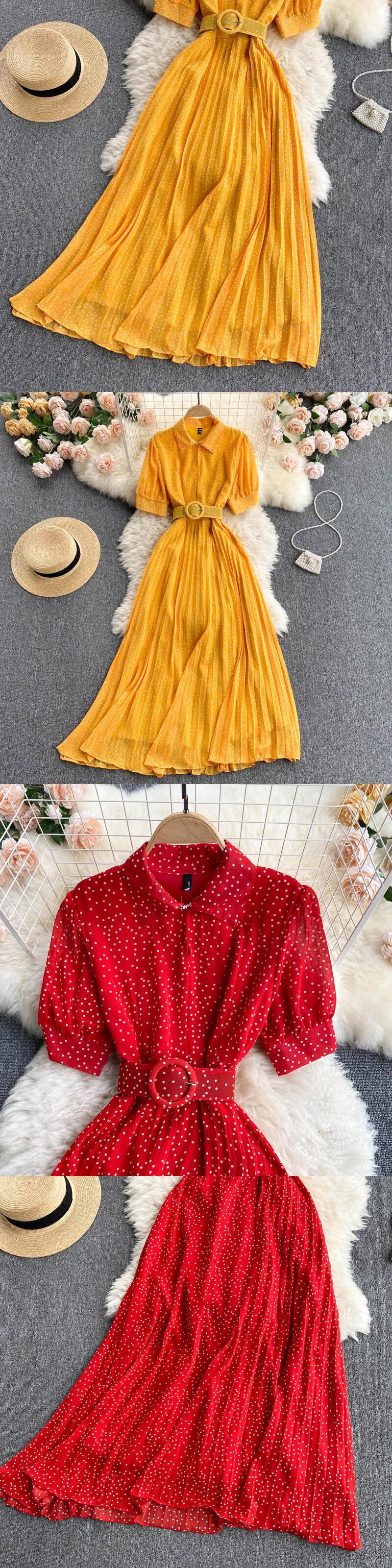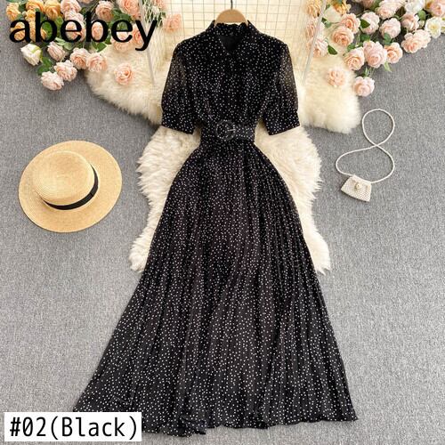 女性レトロドットドレスパフスリーブターンダウン襟プリーツ A ラインドレス夏自由奔放に生きるプリントベルトフリルドレス ラッフル サマー 夏物 ハーネス Aライン Abe78426381144