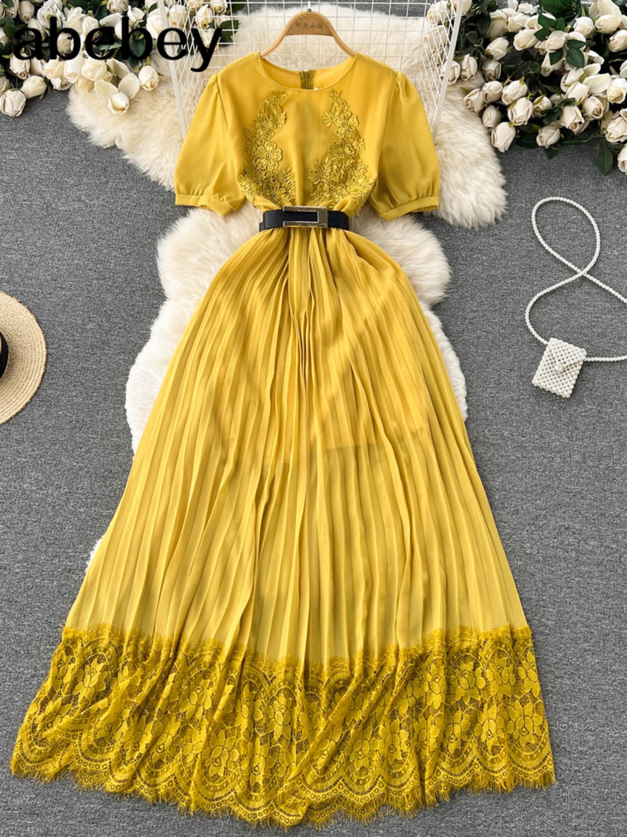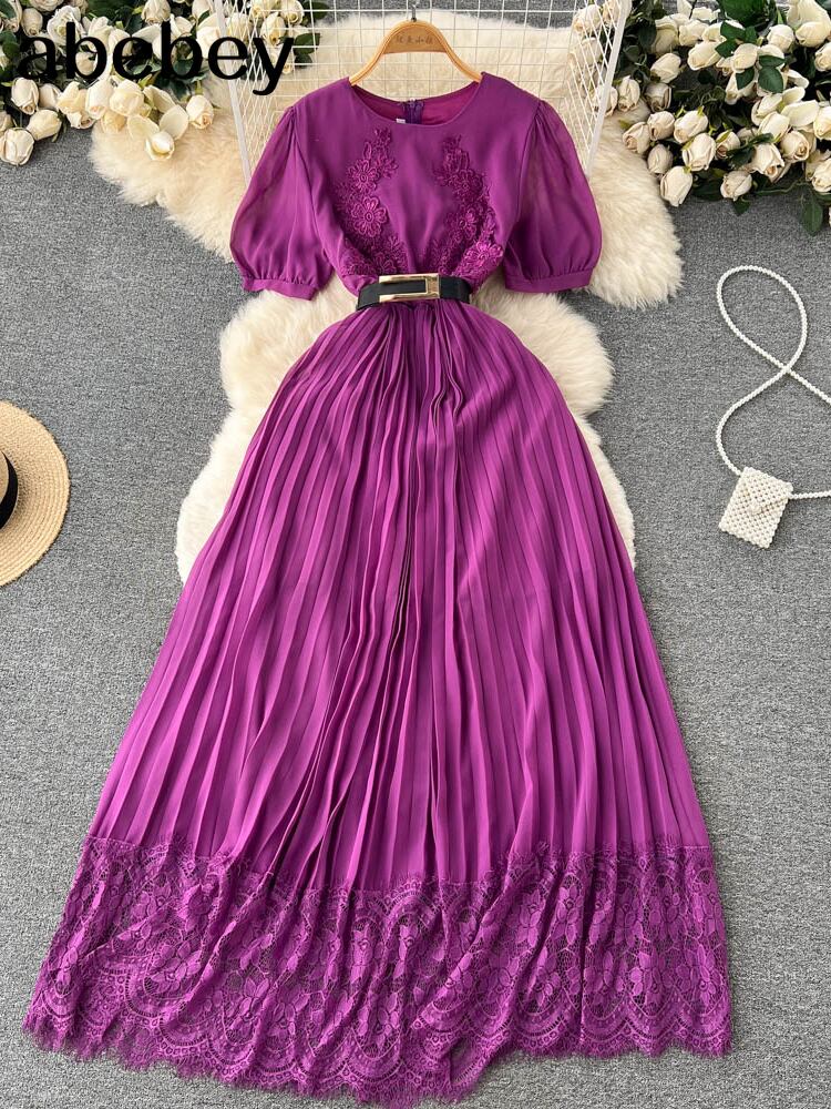夏の女性プリーツロングドレスラウンドネック半袖ウエスト A ラインドレープマキシ Vestidos とベルトローブ ショート ハーフスリーブ サマー 夏物 ハーネス Oネック Aライン Abe42532400158