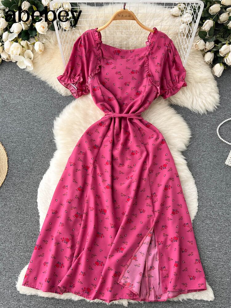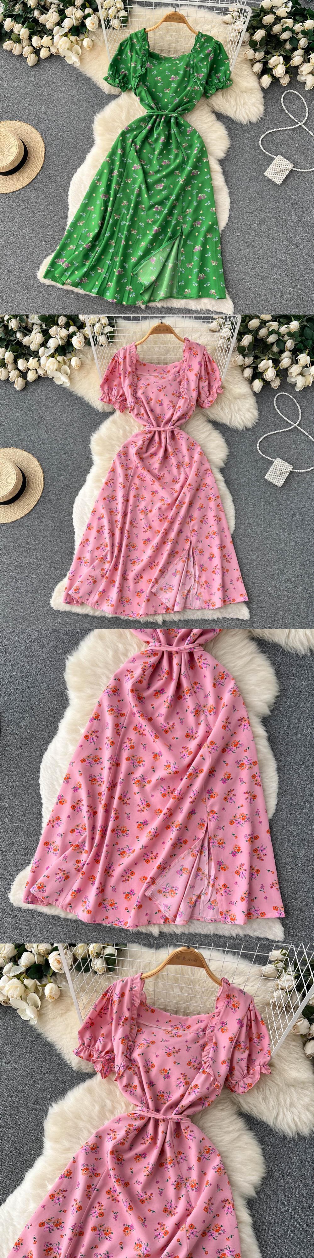 フレンチスクエアカラー花柄セクシーなスプリットロングドレス夏パーティー女性カジュアルビーチホリデーvestidosチュニックエレガントなドレス サマー 夏物 スクウェア Abe24473389623