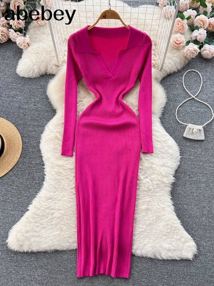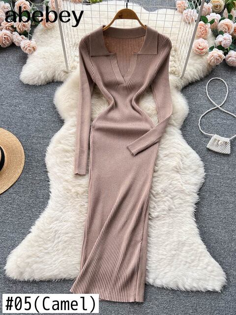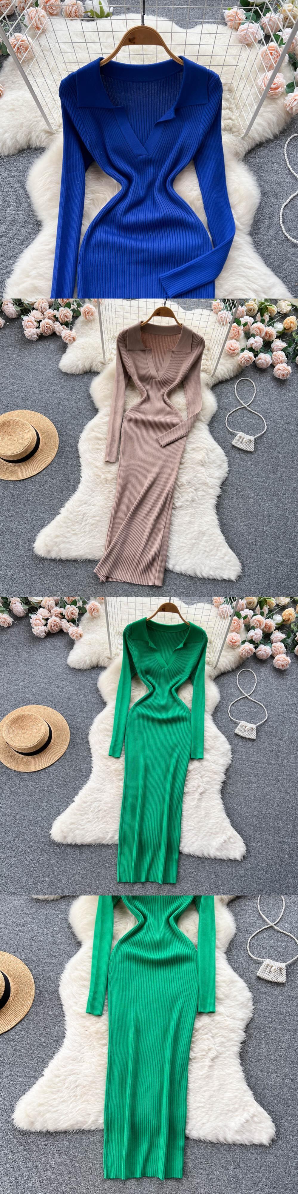 グリーン女性ニットペンシルドレス長袖 V ネック弾性スリムドレス秋冬セクシーなボディコン暖かいセータードレス ロング エラスティック 伸縮 オータム 秋物 ウィンター 冬物 Vネック Abe72095440080