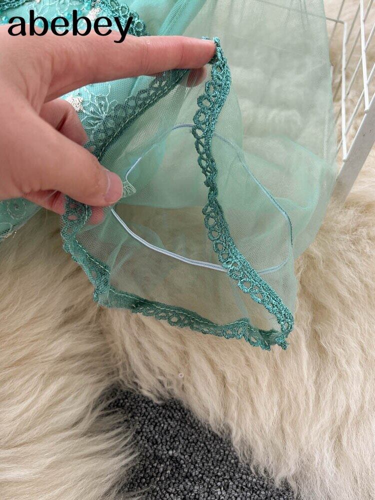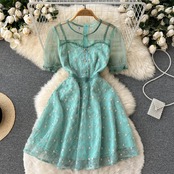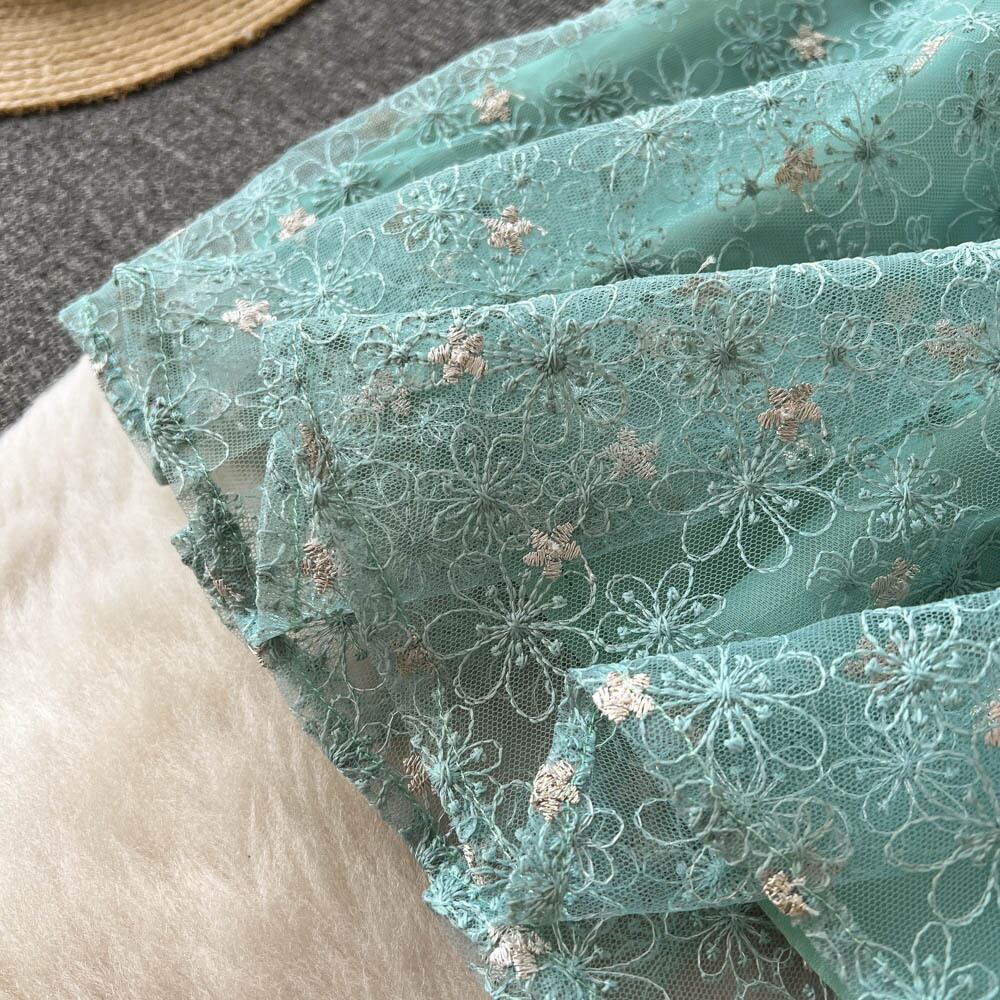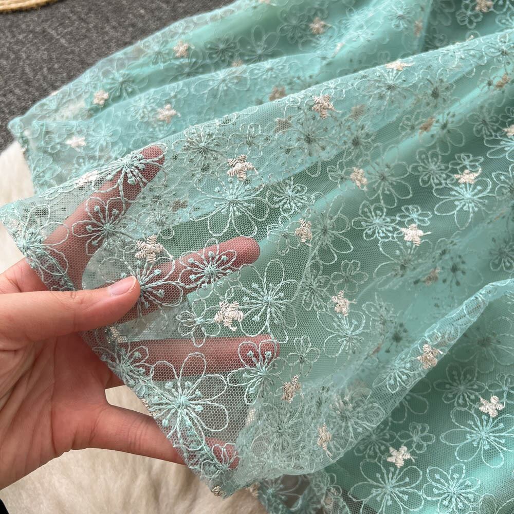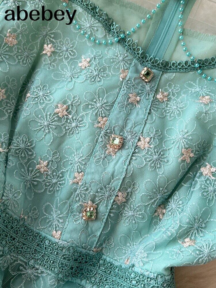 滑走路の女性グリーン O ネックミディドレス高級夏のレースフリルパッチワークメッシュ花刺繍パーティー Vestidos ラッフル サマー 夏物 花柄 Oネック Abe7036728352
