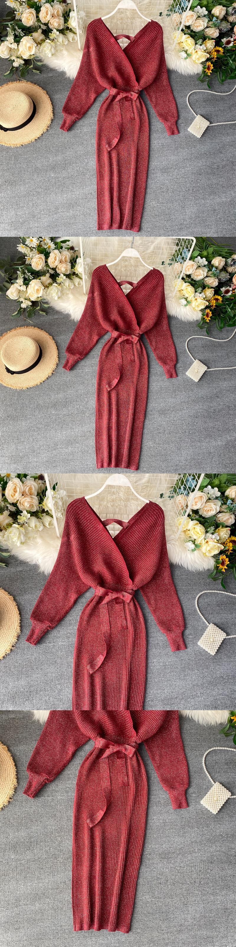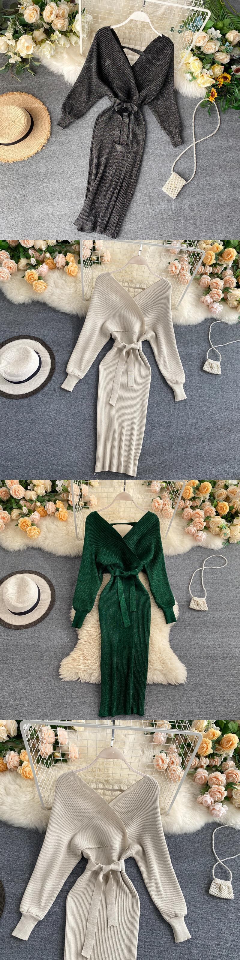 スパークリングセクシーなパーティードレスの女性のセータースリム V ネックの基本的なニットグリーンドレス秋冬バットスリーブ オータム 秋物 ウィンター 冬物 Vネック Abe4797615469