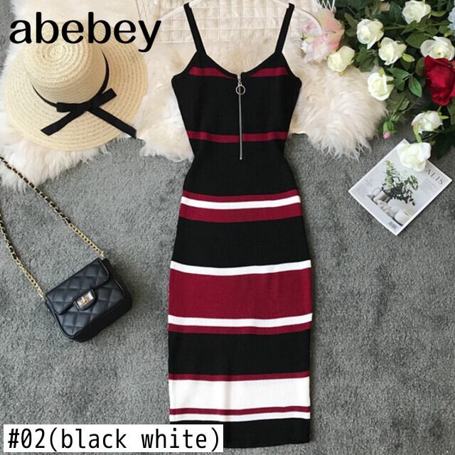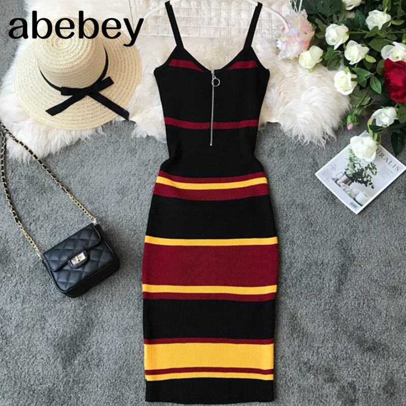 2022 スリム夏ストライププリントニットコットンシースミディドレス女性スパゲッティストラップパーティーボディコン Vestidos サマー 夏物 Abe69122761292