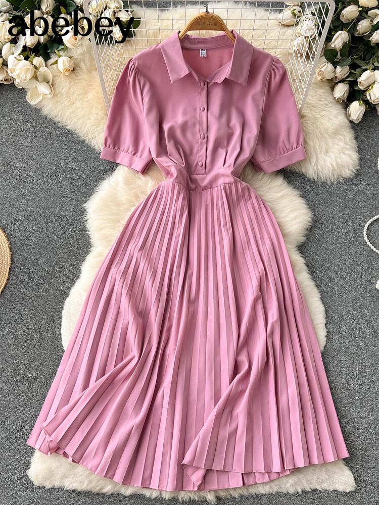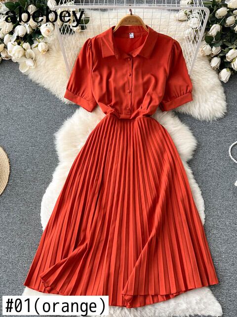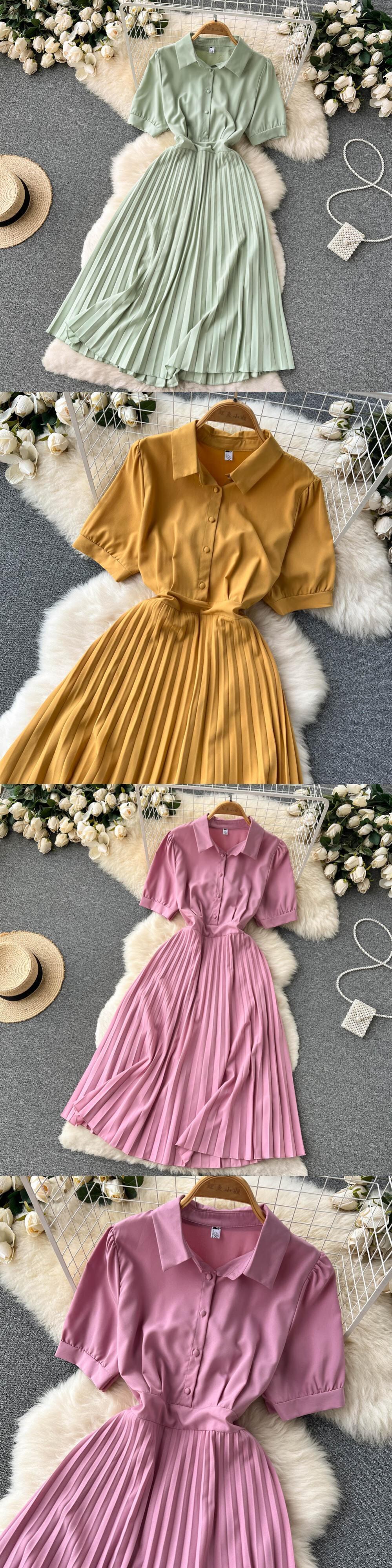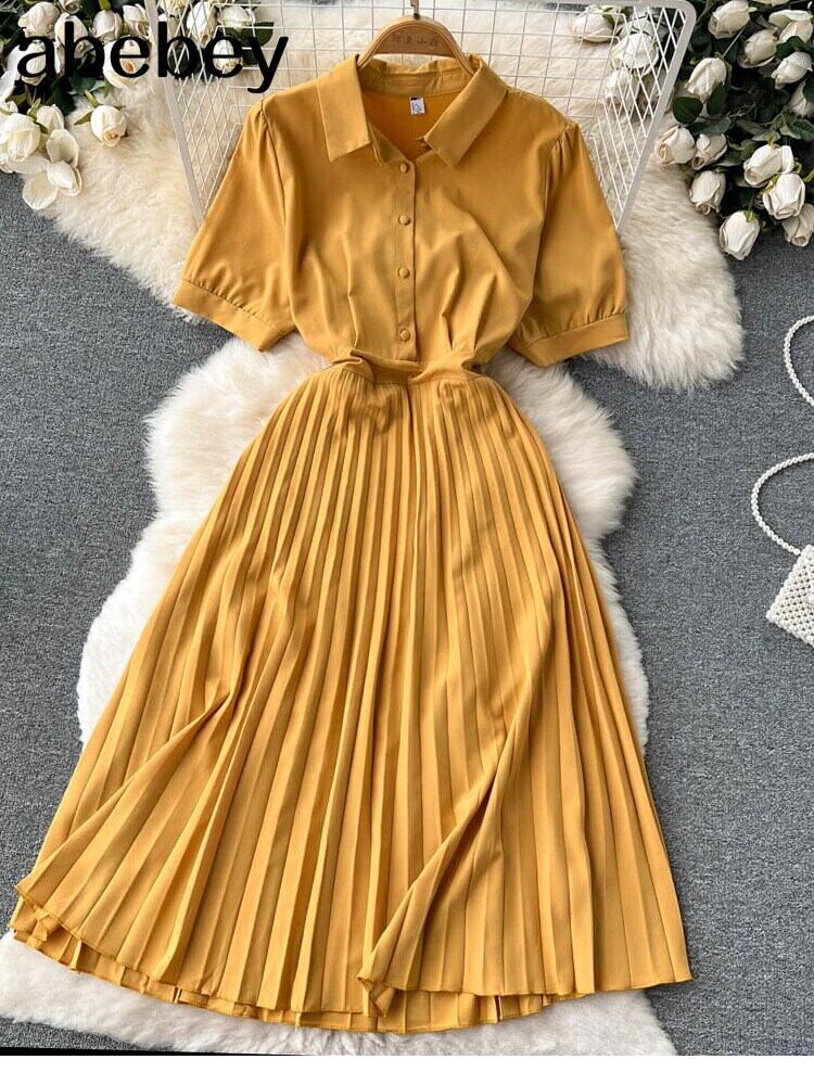 ターンダウン襟プリーツドレス女性春夏イエロー/ブルー/レッドウエスト包帯パーティー Vestidos ローブ スプリング 春物 サマー 夏物 Abe67226141281