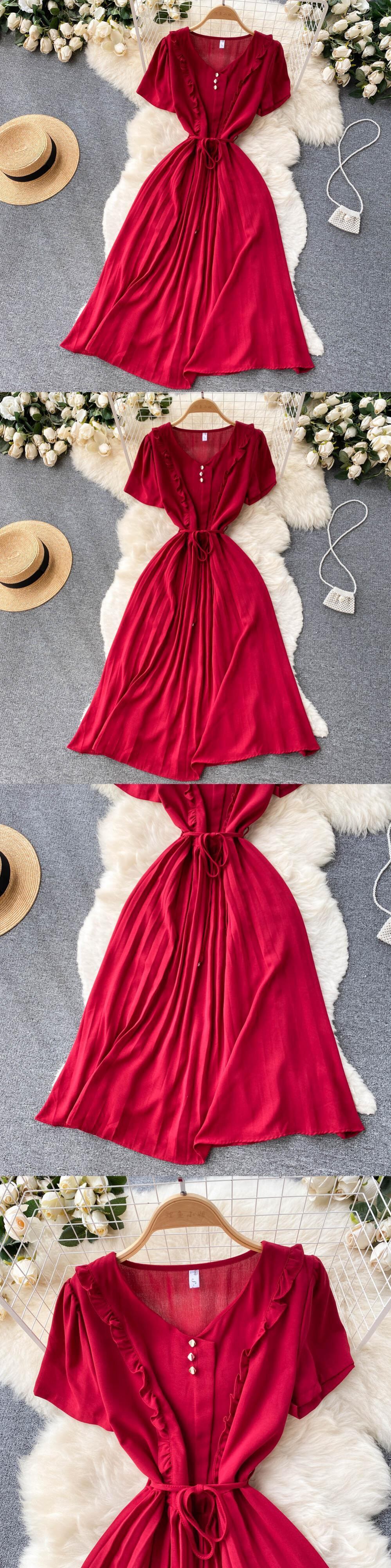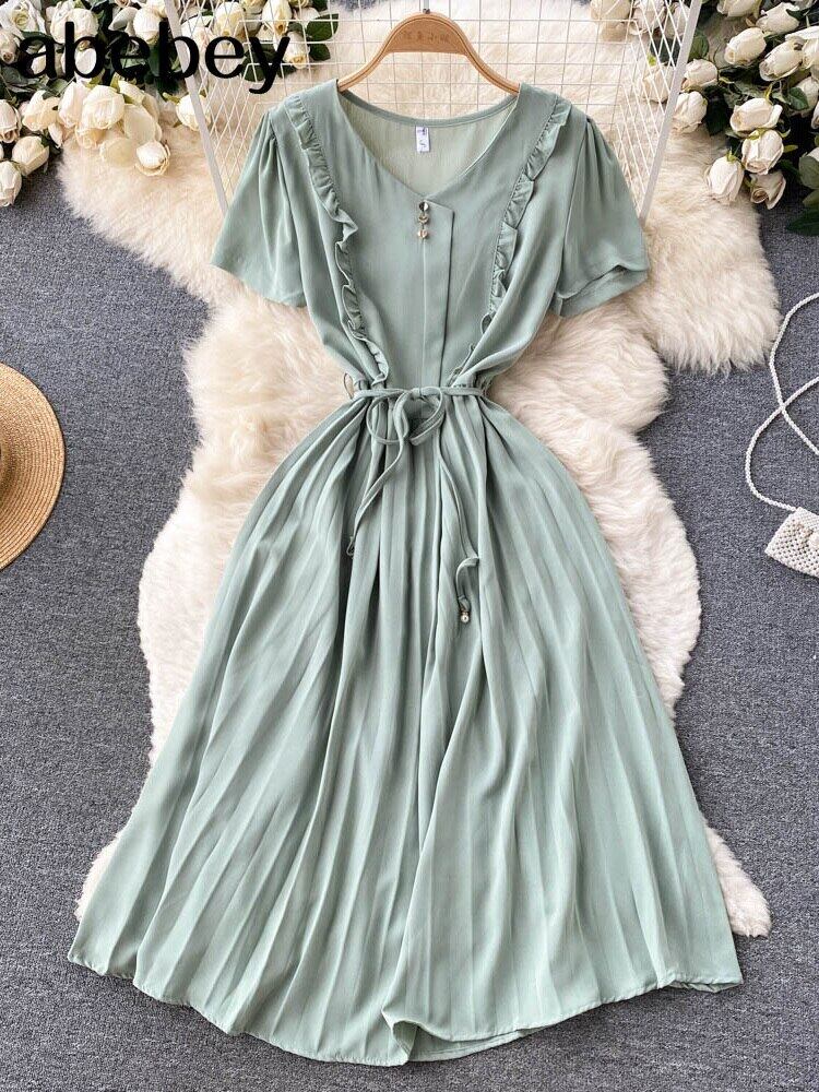 夏の女性の緑/赤/青プリーツ ミディ ドレス V ネック ドレープ パーティー ローブ Vestidos 2022 ブルー サマー 夏物 Vネック グリーン Abe25265738599