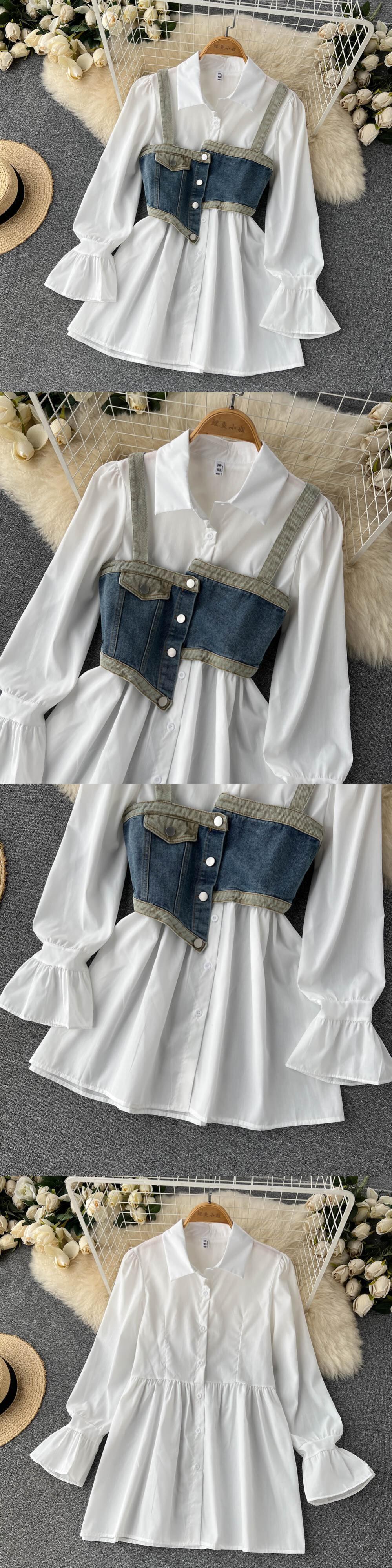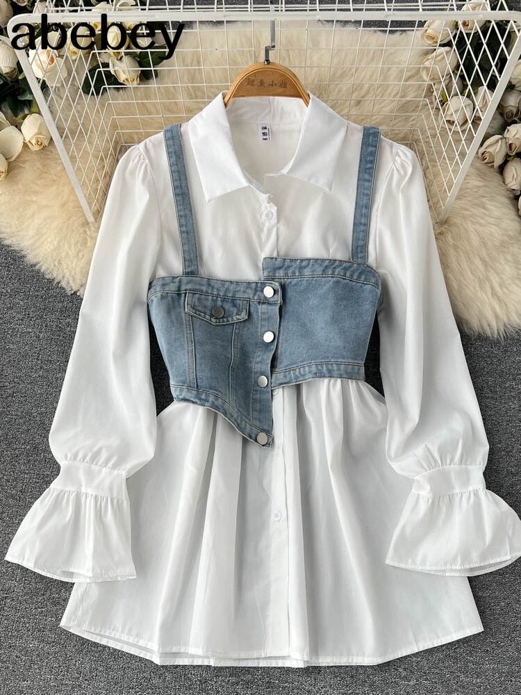 不規則な秋ドレス二枚スーツラフスリーブ白シャツドレス + ミニデニムキャミソールスーツ女性ストリートスリムセット ホワイト オータム 秋物 Abe16561949651