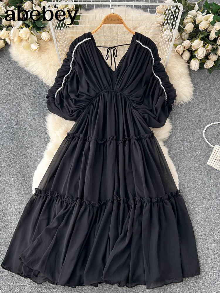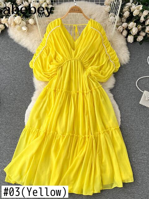 夏の女性プリーツシフォンドレスセクシーな V ネックパフスリーブウエストドレープ Vestidos 休暇ビーチ Midi ローブ サマー 夏物 Vネック Abe8088910831