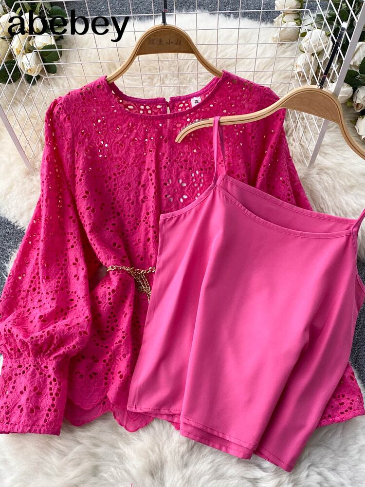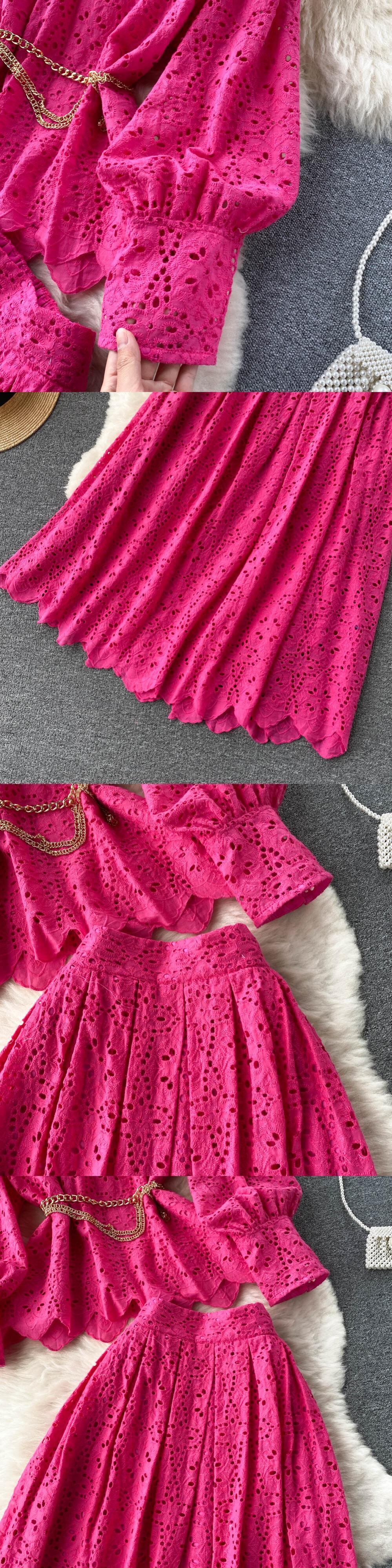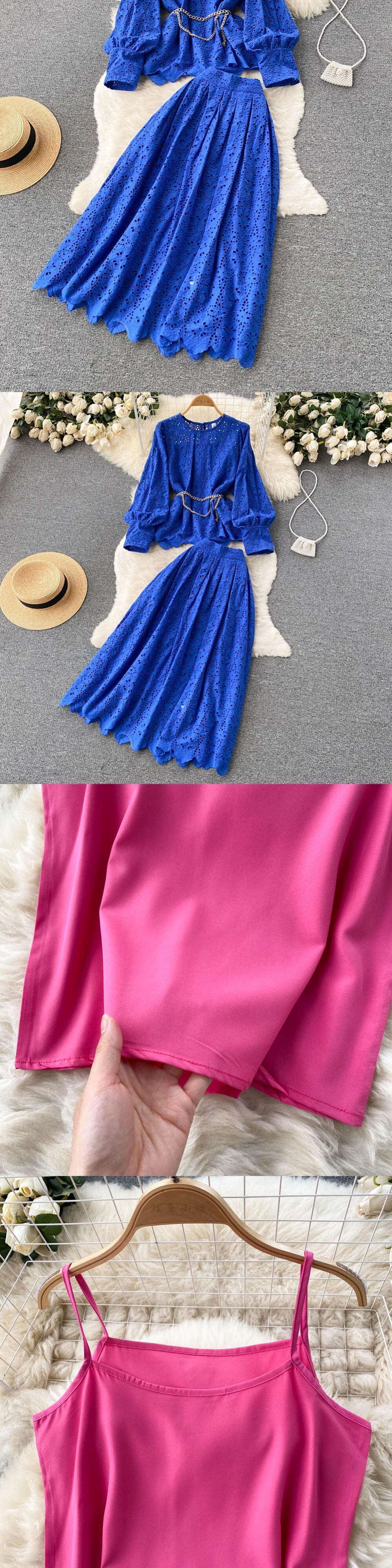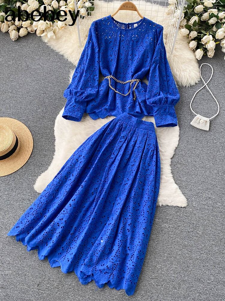 春の女性の夏の白いレースのドレスセット中空アウト刺繍シャツスカート 2 個ローブ衣装シングルボタンコットンマキシドレス ホワイト スプリング 春物 サマー 夏物 Abe7497151599
