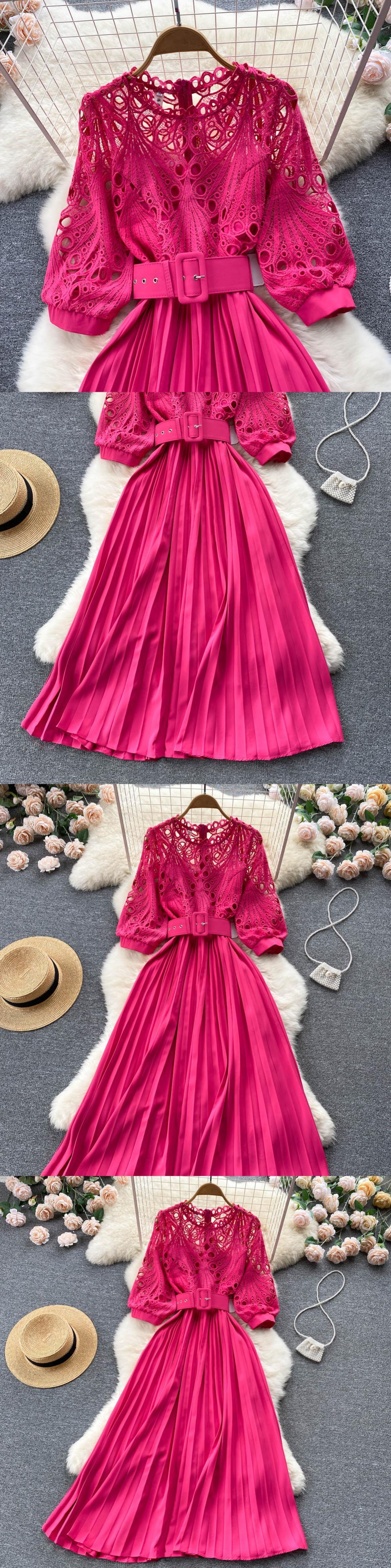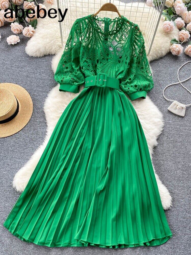 中空アウトレース花刺繍ドレス夏の女性ショートランタンスリーブウエストサッシュマキシロングドレス サマー 夏物 花柄 Abe94320626507
