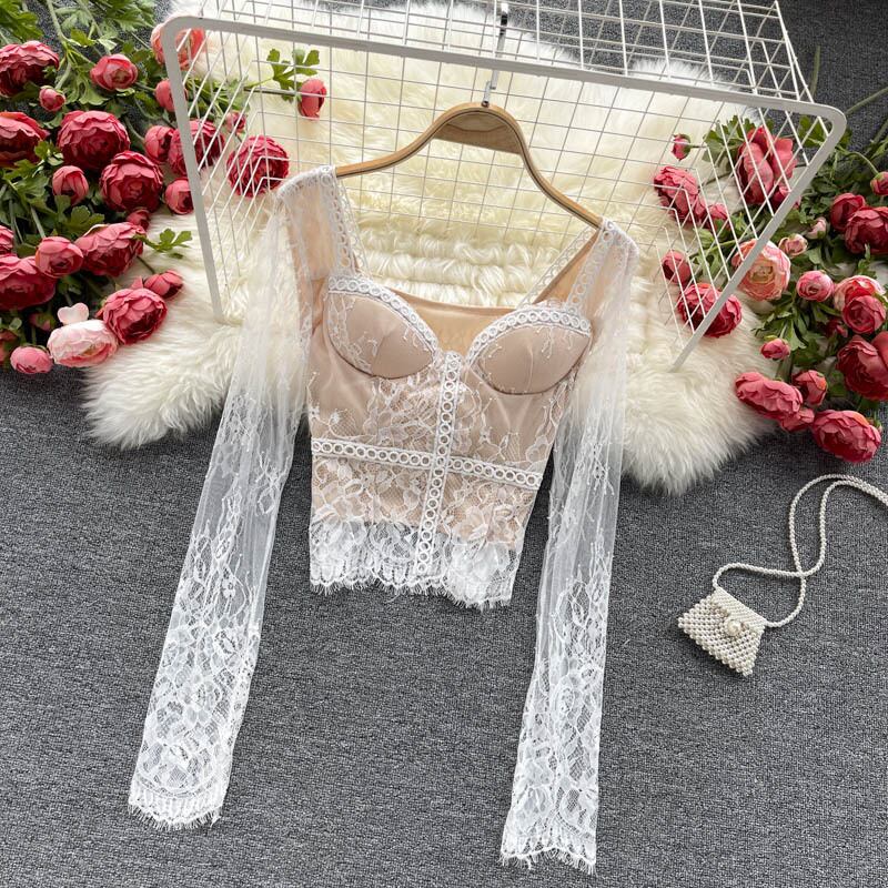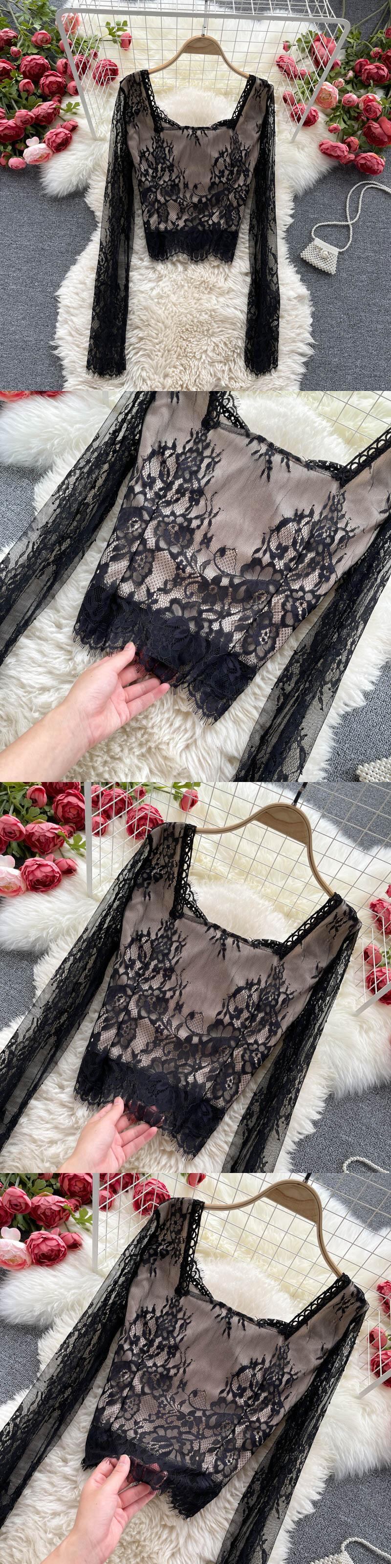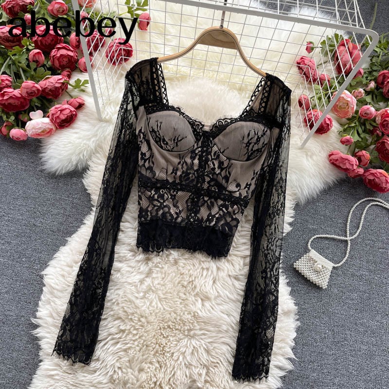 女性黒レースブラウス中空背中の開いた V ネック長袖スリムトップス春ストリートショートブラウス ロング ブラック スプリング 春物 Vネック Abe25224272170