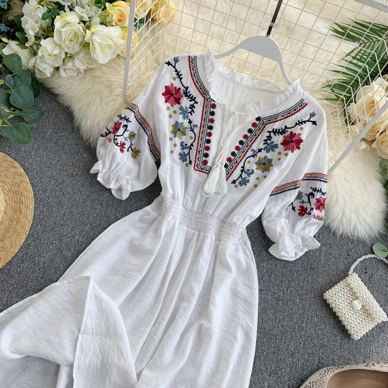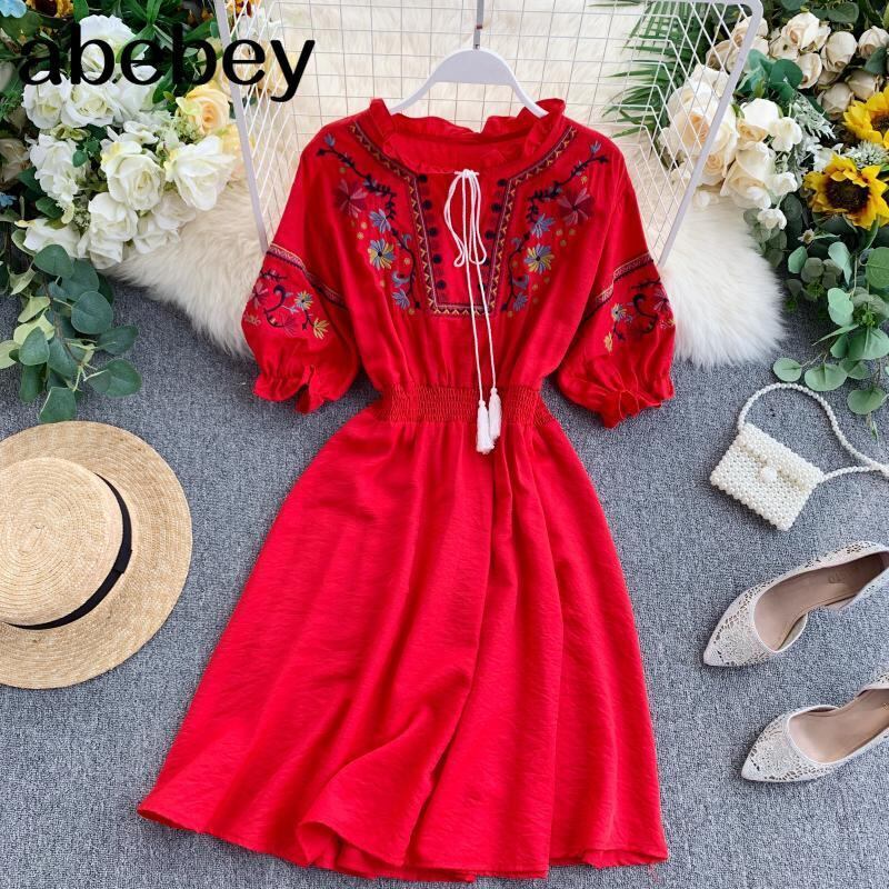 刺繍ドレス自由奔放に生きる白夏ドレス電話ビーチドレス 2022 花柄ボヘミアン服赤森ガール Vestido ホワイト レッド 大人ガーリー スウィート キュート カジュアル サマー 夏物 Abe21970023032