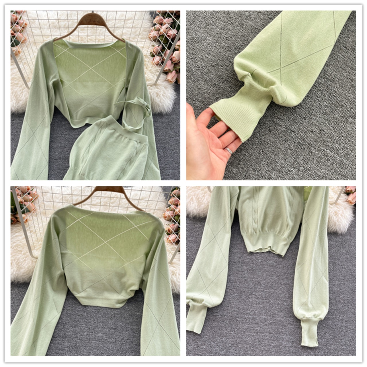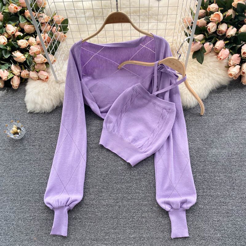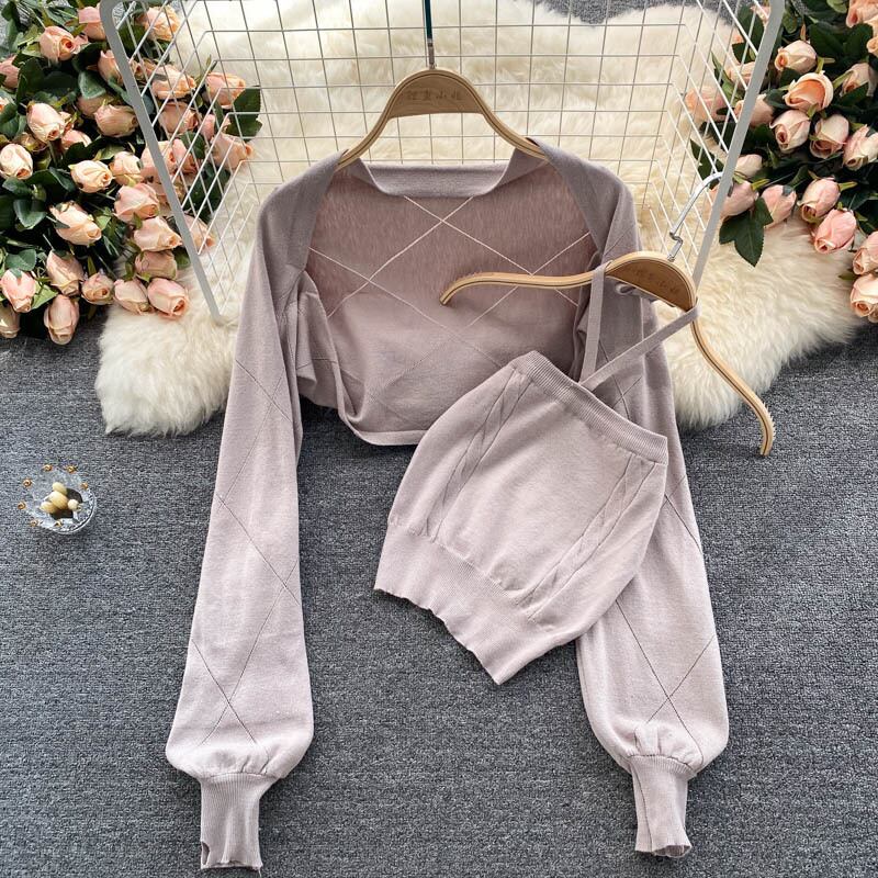 女性秋のニットセット長袖ショートカーディガン + セクシーなオフショルダースリムホルタートップスツーピーススーツ ロング オータム 秋物 Abe19669866053