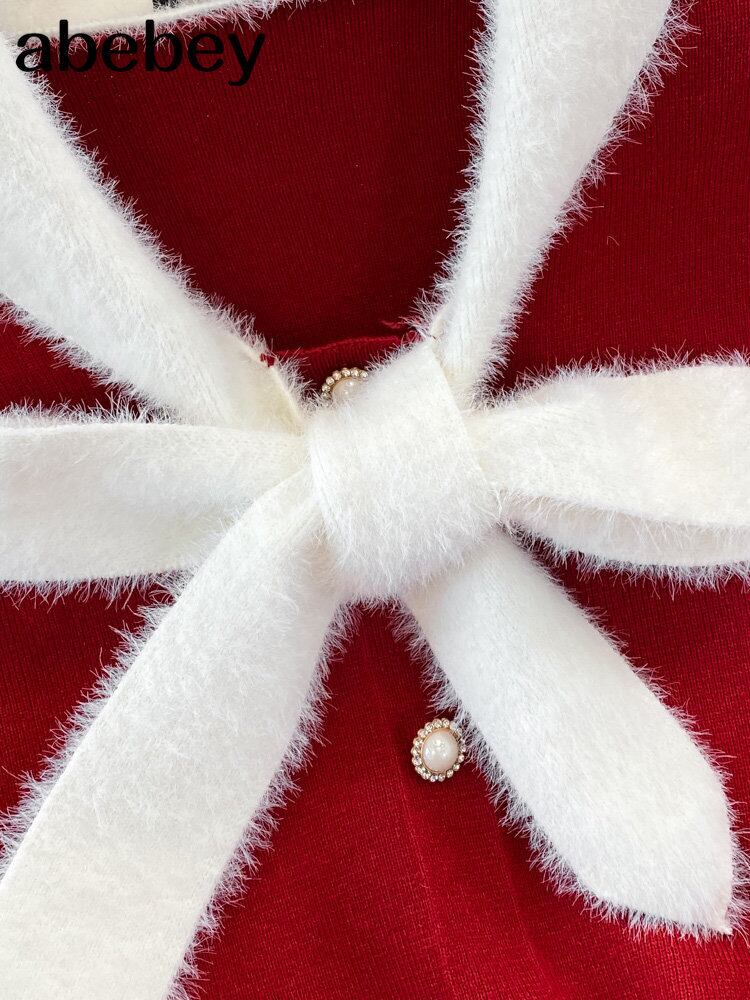 赤のセクシーなニットドレスロングスリーブスリムボウカラーパーティーボディコンセーターAラインミディドレス レッド リボン 長袖 Abe33419234072